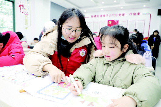 为强化未成年人思想道德建设,促进未成年人健康成长,2023年12月31日,裕安区小华山街道河滨社区、鼓楼街道锥子庙社区结合每周末开展的周末课堂、“‘语’你‘童’行”等主题开展了丰富多彩的未成年人思想道德教育活动,充实孩子们的快乐周末时光。 近年来,裕安区创新工作思路,依托新时代文明实践所(站),完善家长学校阵地,加强和改进未成年人思想道德建设,全区50多个城市社区主动对接周边学校,开展校社携手共建,每月至少开展一次实践活动,已经打造出“‘语’你‘童’行”“运动青春”“周六小课堂”等形式多样、内容丰富的未成年人活动品牌特色项目。截至目前,校社共建活动已举办近1000场,参与的孩子及家长近30000人次,全面提升了社区居民对未成年人思想道德建设工作的知晓率和满意度,形成了全区上下关心关爱未成年人健康成长的良好氛围。 图为在裕安区鼓楼街道锥子庙社区,志愿者教孩子们画画。
