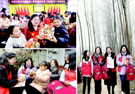 1月21日,蚌埠医科大学精神卫生学院“阳光陪伴”志愿者团队的4名队员,来到金安区淠东乡徐郢村,开展中国儿童少年基金会“守护童年”公益项目活动,为20多名留守儿童送上“爱心礼包”,并带领孩子们一起做游戏、画家乡、送春联、为孩子们开展冬季疾病防治知识讲座,利用寒假陪伴乡村留守儿童健康成长、快乐生活。 蚌埠医科大学精神卫生学院大一学生郑远昕(前排中)和金安区淠东乡徐郢村的留守儿童一起拼装“龙头灯笼”。(左上) 蚌埠医科大学精神卫生学院的大学生志愿者来到金安区淠东乡徐郢村金穗小学三年级学生王芊悦(中)家中走访。(左下) 蚌埠医科大学精神卫生学院4名大学生志愿者在金安区淠东乡徐郢村乡间小路上行走,为村里的留守儿童送上“爱心礼包”。(右) 本报记者 陈力 摄