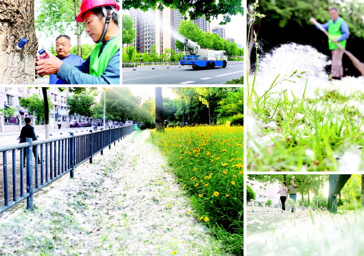 “从4月底以来,我们就陆续对公园里的杨树和柳树注射这种‘絮静’针剂,但是抑制针剂是当年放置,次年才能见效……”5月12日,六安城区龙河公园管理人员一边在给部分杨树补植花芽抑制针剂,一边告诉记者,这种生长快、成活率高、绿化量大、养护成本低的杨树,虽然飘絮但却是城市绿化的主力军(左上图左一)。 立夏前后,随着气温快步回升,在部分路段、公园、景观带白色毛絮漫天飞舞宛若飞雪,让过往行人的视线不堪其扰(右下图),原本碧绿的草坪白茫茫一片,与一旁正在绽放的鲜花形成鲜明对比(左下图),出行市民非但无暇驻足观赏感受这唯美浪漫和诗意美景,却全副“捂”装躲“毛毛”。 近日,记者走访园林部门了解到,杨树具有防风沙、吸废气、释氧气、降扬尘、调湿度、美环境等作用,具有较大的生态价值和效益。为及时有效治理飞絮,市相关部门目前已采用喷雾车加大绿化喷淋(左上图左二)、增加地面清扫频率(右上图)、给公园中的杨树和柳树注射花芽抑制针剂等措施降低飘絮。医务和消防部门提醒广大市民,杨絮本身无毒,但在飘飞过程中会携带灰尘和细菌,被过敏体质者或者呼吸道疾病易感染人群吸入鼻腔易引起流鼻涕、打喷嚏、呼吸急促等症状,飘絮季节建议穿长袖长裤、戴好口罩和眼镜等外出;同时,杨絮柳絮含大量油脂,遇明火会引起烘燃,蔓延迅速,切勿乱扔烟头,以免引发火灾。 本报记者 田凯平 文/图