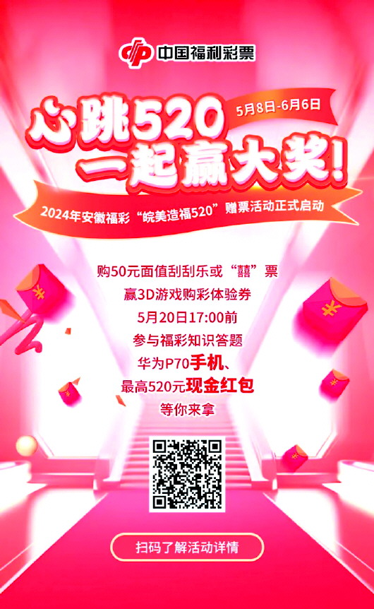 在这个浪漫的五月,花开如火,爱意如潮。当福彩邂逅5·20,又将碰撞出怎样的惊喜? 亲爱的彩民朋友们准备好迎接一场幸福与幸运交织的狂欢了吗? 即日起,“百店联动 皖美造福”2024安徽福彩5·20嘉年华正式开启,3D游戏购彩体验券、华为Pura70Pro手机、还有最高面额520元的现金红包,一起为浪漫“添彩”。 活动介绍 5月8日至6月6日活动期间,彩民购买刮刮乐50元面值任一彩票或“囍”游戏彩票,中奖者进入“安徽福彩”微信公众号热门活动专栏“皖美造福520”赠票活动,扫码抽奖就有机会获得4元面值的3D游戏“1D”或“2D”玩法购彩体验券。 5月20日17:00前,参与福彩知识答题还可抽取华为Pura70Pro手机、最高面额520元的红包哟!直播现场更有多轮红包相赠,让我们一起期待中奖的幸运瞬间吧。 活动时间 活动周期:2024年5月8日—6月6日 直播时间:2024年5月20日16:00—18:00 活动票种 本次活动主要票种之一为刮刮乐新票“囍”。该款刮刮乐游戏面值20元,一套4张,分别展示了“龙凤呈祥”“永结同心”“丰衣足食”“称心如意”四个场景;延续了福彩以往的国潮风格,整体配色以红黄为主,色彩鲜艳、喜庆大气;票面正中央的金色“囍”字,刮开区的“囍”图符,配合按压的“囍”字花纹,处处呼应主题,吸引购彩者一探惊“囍”。 该款刮刮乐一共25次中奖机会,最高奖金100万,刮开覆盖膜,如果刮出任何奖金金额,即可获得该奖金。中奖奖金兼中兼得。 活动福利 奖上嘉奖 奖金不断 5月8日—6月6日活动期间,凡在安徽省内福彩销售网点,购买安徽福彩刮刮乐50元面值任一彩票或“囍”游戏彩票的中奖者,兑奖后,关注“安徽福彩”微信公众号,进入热门活动专栏“皖美造福520”赠票活动,扫描中奖彩票保安区二维码,参与转盘抽奖活动,就有机会获得4元面值的3D游戏“1D”或“2D”玩法购彩体验券。好运翻倍,快乐无界! 奖上抽奖 “囍上加喜” 5月8日—5月20日17:00前,参与“安徽福彩”微信公众号“皖美造福520”赠票活动页面答题的市民和参与抽奖的彩民,均有机会在“百店联动 皖美造福”安徽福彩5·20嘉年华直播现场抽奖环节获得华为Pura70pro手机或最高面值520元的现金红包等奖品! 直播互动 瓜分红包 5月20日16:00—18:00,直播间内,红包雨下个不停,每一轮都可能砸中幸运的你!不仅如此,还有不定时互动答题送奖,以及“囍从天降”试刮团活动,试刮出的所有奖金将会以现金红包的方式发放给直播间观众哦! 活动征集 5月9日至5月18日,“以爱之名,心动520”爱情故事征集活动同步开启,诚挚邀请每一位拥有动人爱情的你,来分享独家记忆。 发微博带话题#百店联动皖美造福#即可参与,文字、图片、视频形式不限。最打动人心的情侣将被邀请到2024安徽福彩5·20嘉年华活动现场(5月20日下午合肥之心城一楼中庭),不仅能在众人面前分享你们的爱情传奇,还能在现场互动环节中,收获满满的祝福与惊喜大奖!此外将遴选优秀作品做成集锦在活动中进行展示,其作者可获赠福彩特别奖品。 征集活动咨询电话:18055618175 这个5·20不见不散,让我们锁定安徽福彩,共赢好礼开启浪漫之旅,向幸福出发吧。