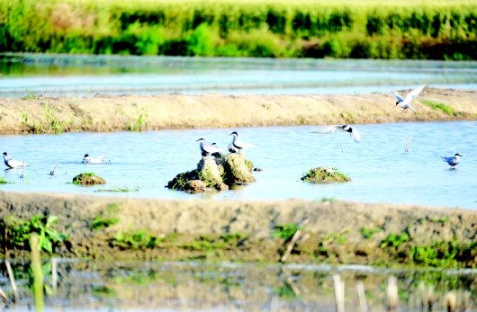 5月8日,一群鸟儿在金安区木南现代农业示范园水塘中飞舞觅食。初夏时节,木南现代农业示范园生态优美,水田池塘里鱼虾活跃,吸引许多鸟儿飞来觅食。 郑金强 摄