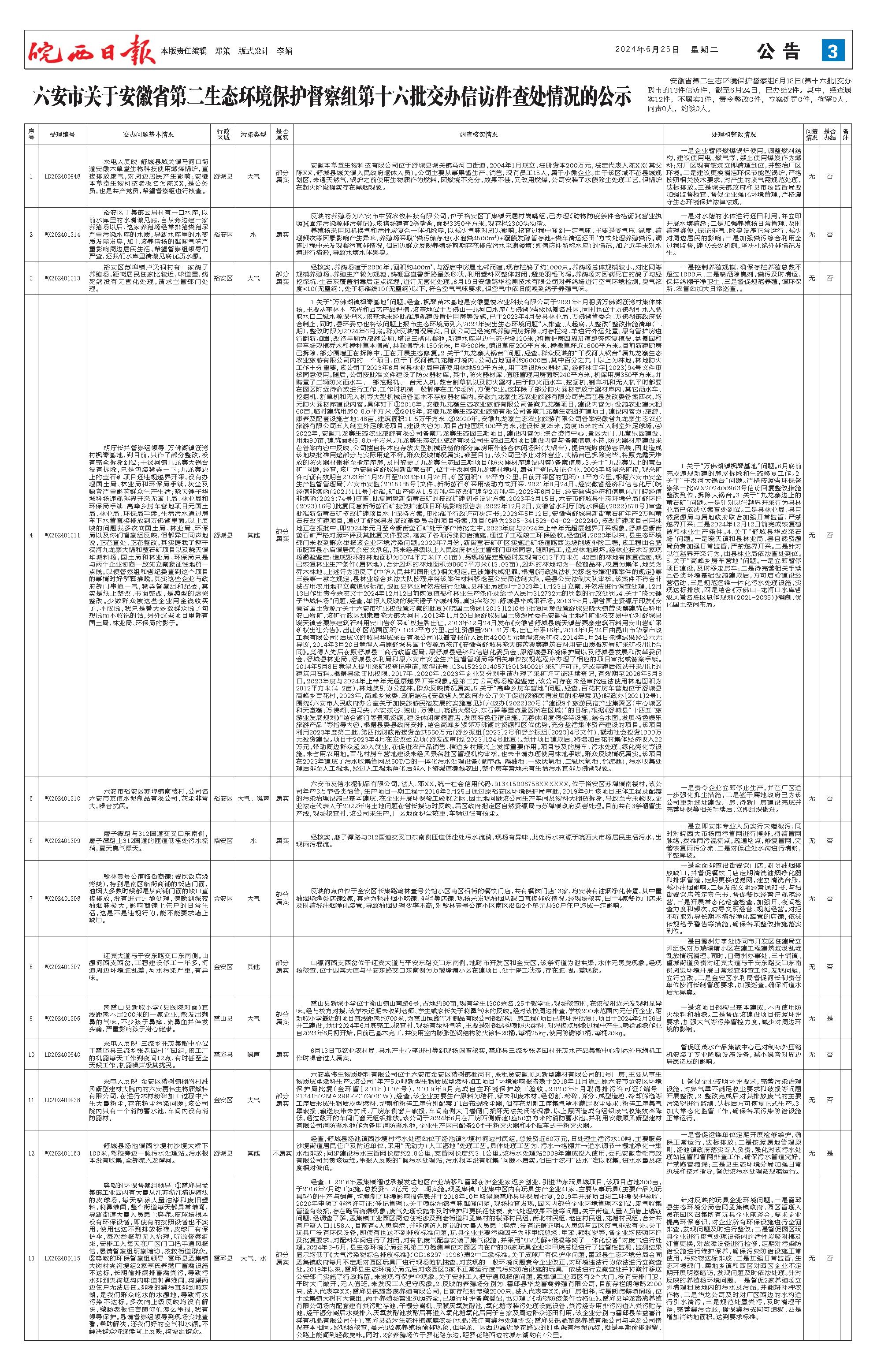 安徽省第二生态环境保护督察组6月18日(第十六批)交办我市的13件信访件,截至6月24日,已办结2件。其中,经查属实12件,不属实1件,责令整改0件,立案处罚0件,拘留0人,问责0人,约谈0人。 序号 受理编号 交办问题基本情况 行政区域 污染类型 是否属实 调查核实情况 处理和整改情况 问责情况 是否办结 备注 1 LD202400948 来电人反映:舒城县城关镇马河口街道安徽本草堂生物科技使用燃煤锅炉,直接排放废气,对周边居民产生影响;安徽本草堂生物科技老板名为陈XX,是公务员,也是共产党员,希望督察组进行核查。 舒城县 大气 部分属实 安徽本草堂生物科技有限公司位于舒城县城关镇马河口街道,2004年1月成立,注册资本200万元,法定代表人陈XX(其父陈XX,舒城县城关镇人民政府退休人员)。公司主要从事果酱生产、销售,现有员工15人,属于小微企业。由于该区域不在县城规划区,未通天然气,锅炉之前使用生物质作为燃料,因燃烧不充分,效果不佳,又改用燃煤,公司安装了水膜除尘处理工艺,但锅炉在起火阶段确实存在黑烟现象。 一是企业暂停燃煤锅炉使用,调整燃料结构,建议使用电、燃气等,禁止使用煤炭作为燃料;对厂区现有散煤立即清理到位,并整治厂区环境。二是建议更换清洁环保节能型锅炉,严格按照相关技术要求,对产生的废气需规范处理,达标排放。三是城关镇政府和县市场监管局要加强监督检查,督促企业强化环境管理,严格遵守生态环境保护法律法规。 无 否 2 WX202401314 裕安区丁集镇云居村有一口水库,以前水库里的水清澈见底,自从旁边建一家养猪场以后,这家养猪场经常排猪粪猪尿严重污染水库的水质,导致水库里的水变质发黑发臭,加上该养猪场的难闻气味严重影响周边居民生活,希望督察组领导们严查,还我们水库里清澈见底优质水源。 裕安区 水 属实 反映的养殖场为六安市中贸农牧科技有限公司,位于裕安区丁集镇云居村岗嘴组,已办理《动物防疫条件合格证》《营业执照》《固定污染源排污登记》。该猪场建有2栋猪舍,面积3350平方米,现存栏2300头幼猪。养殖场采用风机换气和活性炭复合一体机除臭,以减少气味对周边影响,核查过程中闻到一定气味,主要是受气压、温度、清理频次等因素影响产生异味。养殖场采取“粪污储存池(水泡粪4500m3)+覆膜发酵暂存池+粪车清运还田”方式处理养殖粪污。调查过程中未发现粪污直排情况,但周边群众反映养殖场前期存在排放污水至谢楼塘(即信访件所称水库)的情况,加之近年未对水塘进行清淤,导致水塘水体黑臭。 一是对水塘的水体进行还田利用,并立即开展水塘清淤;二是加强养殖场日常管理,及时清理粪便,保证排气、除臭设施正常运行,减少对周边居民的影响;三是加强粪污综合利用全过程监督,建立长效机制,坚决杜绝外排情况发生。 无 否 3 WX202401313 裕安区苏埠镇卢氏祠村有一家鸽子养殖场,距离居民住家比较近,味道重,病死鸽没有无害化处理,请求主管部门处理。 裕安区 大气 部分属实 经核实,养鸽场建于2006年,面积约400m2,与舒启中房屋比邻而建,现存栏鸽子约1000只。养鸽场总体规模较小,对比同等规模养殖场,养殖生产较为规范,鸽棚垂直鲁新路呈条形状,利用塑料网整体封闭,避免羽毛飞泻。养鸽场对因病死亡的鸽子均经挖深坑、生石灰覆盖消毒后定点深埋,进行无害化处理。6月19日安徽鹊华检测技术有限公司对养鸽场进行空气环境检测,臭气浓度<10(无量纲),处于标准线10(无量纲)以下,符合空气气味要求,但空气中依旧能嗅到鸽子养殖气味。 一是控制养殖规模,确保存栏养殖总数不超过1000只;二是喷洒除臭剂,粪污及时清运,保持鸽棚干净卫生;三是督促规范养殖,镇环保所、农管站加大日常巡查,。 无 否 4 WX202401311 胡厅长并督察组领导:万佛湖镇汪湾村枫琴基地,到目前,只作了部分整改,没有完全拆除到位;干汊河镇九龙寨大锅台没有拆除,只是包装糊弄一下;九龙寨边上的莹石矿项目还违规越界开采,没有办理国土局、林业局和环保局手续,灰尘及噪音严重影响群众生产生活;晓天锤子华城料场违规越界开采无国土局、林业局和环保局手续;高峰乡房车营地项目无国土局、林业局、环保局手续,生活污水通过房车下水管直接排放到万佛湖里面。以上反映的问题我多次向国土局、林业局、环保局以及你们督察组反映,但都异口同声地说,正在查处、正在整改,其实据我了解干汊河九龙寨大锅和莹石矿项目以及晓天镇华城料场,国土局和林业局、环保局只是与两个企业协商一致先立案象征性地罚一点钱,以便督察组和省纪委查到这个项目的事情时好解释推脱,其实这些企业与政府部门串通一气,糊弄督察组和纪委,其实是纸上整改、书面整改,是典型的虚假整改。少数群众被这些企业用金钱收买了,不敢说,我只是替大多数群众说了句想说而不敢说的话,另外这些项目里都有国土局、林业局、环保局的影子。 舒城县 其他 部分属实 1.关于“万佛湖镇枫琴基地”问题,经查,枫琴苗木基地是安徽星悦农业科技有限公司于2021年8月租赁万佛湖汪湾村集体林场,主要从事林木、花卉和园艺产品种植。该基地位于万佛山—龙河口水库(万佛湖)省级风景名胜区,同时也位于万佛湖引水入肥取水口二级水源保护区。该基地未经批准违规建设管护用房等设施,已于2023年4月被县林业局、万佛湖管委会、万佛湖镇政府联合制止。同时