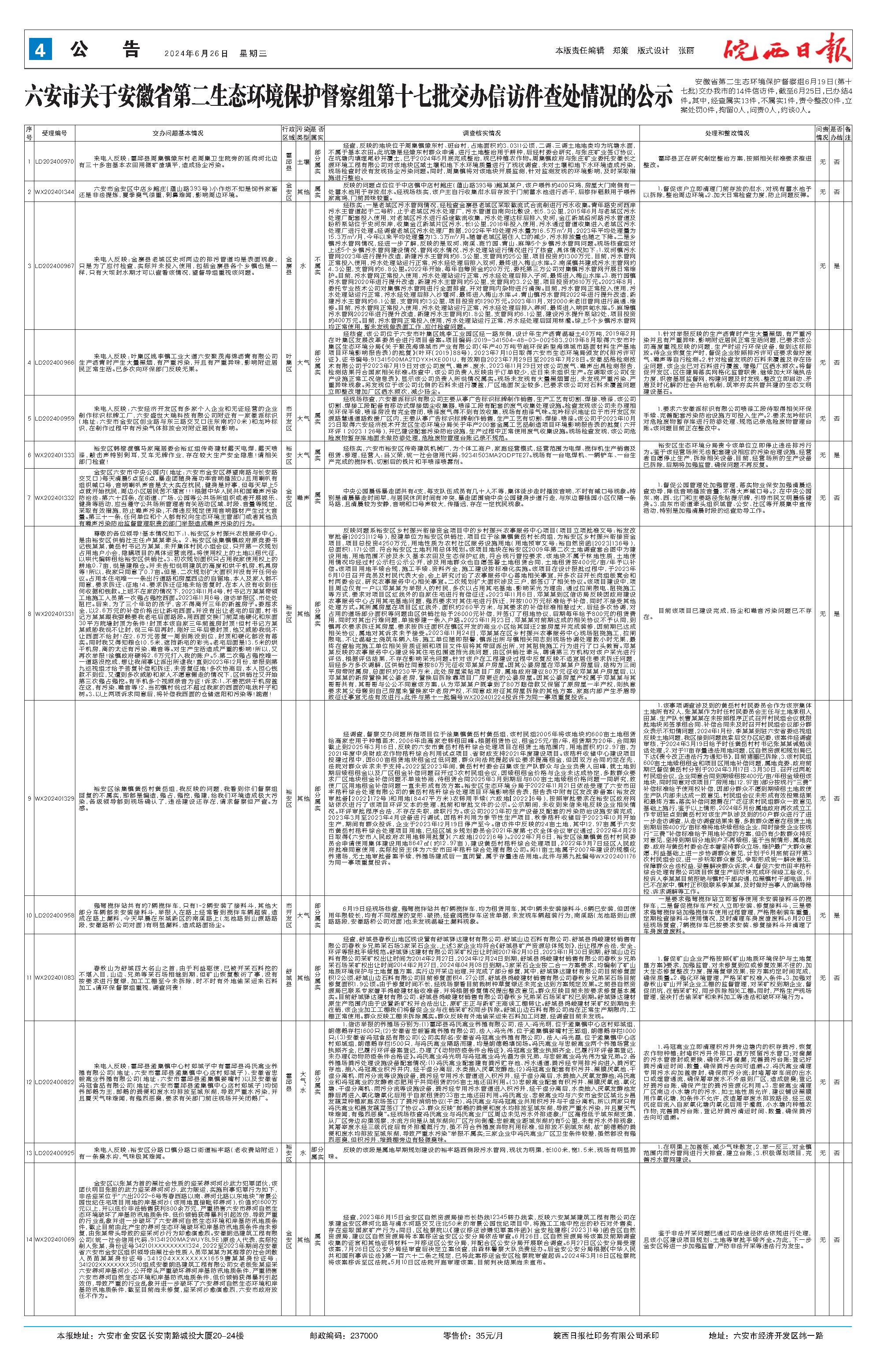 安徽省第二生态环境保护督察组6月19日(第十七批)交办我市的14件信访件,截至6月25日,已办结4件。其中,经查属实13件,不属实1件,责令整改0件,立案处罚0件,拘留0人,问责0人,约谈0人。 序号 受理编号 交办问题基本情况 行政区域 污染类型 是否属实 调查核实情况 处理和整改情况 问责情况 是否办结 备注 1 LD202400970 来电人反映:霍邱县周集镇燎东村老周集卫生院旁的延岗河北边有三十多亩基本农田用微矿渣填平,造成扬尘污染。 霍邱县 土壤 部分属实 经查,反映的地块位于周集镇燎东村、班台村,占地面积约3.0311公顷,二调、三调土地地类均为坑塘水面,不属于基本农田。此坑塘是经燎东村群众申请,进行土地整治用于耕种,后经村委会研究,与张庄矿业签订协议,在坑塘内填埋尾砂并覆土,已于2024年5月底完成整治,现已种植农作物。周集镇政府与张庄矿业委托安徽长之源环境工程有限公司对该地块区域土壤和地下水环境质量进行了现状调查,未对土壤和地下水环境造成污染,现场检查时没有发现扬尘污染问题。同时,周集镇将对该地块开展监测,针对监测发现的环境影响,及时采取措施进行整治。 霍邱县正在研究制定整治方案,按照相关标准要求推进整改。 无 否 2 WX202401344 六安市金安区中店乡鲍庄(蕴山路393号)小作坊不知是饲养家畜还是非法提炼,夏季臭气很重,刺鼻难闻,影响周边环境。 金安区 其他 属实 反映的问题点位位于中店镇中店村鲍庄(蕴山路393号)鲍某某户,该户喂养约400只鸡,房屋大门南侧有一处蓄水池用于存放泔水。经现场核实,该户主自行收集泔水后存放于门前蓄水池进行沥干,后掺拌稻麸用于喂养家禽鸡,门前异味较重。 1.督促该户立即清理门前存放的泔水,对现有蓄水池予以拆除,整治周边环境。2.加大日常检查力度,防止问题反弹。 无 否 3 LD202400967 来电人反映:金寨县老城区史河两边的排污管道均是表面现象,只是为了应付检查,实际并未投入使用,包括金寨县各个乡镇也是一样,只有大坝封水期才可以查看该情况,望督导组重视该问题。 金寨县 水 不属实 经核实:一是老城区污水管网情况,经检查金寨县老城区采取截流式合流制进行污水收集。青年路史河西岸污水主管道起于二号桥,止于老城区污水处理厂,污水管道自南向北敷设,长5.3公里,2015年6月与老城区污水处理厂配套投入使用,对老城区污水进行沿途截流收集,污水处理达标后排入史河;金江新城沿河路污水管道及盼桥泵站位于史河东岸,收集金江新城片区污水,长1公里,2016年投入使用,污水通过管道收集进入老城区污水处理厂进行处理。经调查老城区污水处理厂数据,2022年平均处理污水量为16.5万m3/月,2023年平均处理量为15.3万m3/月,今年以来平均处理量为13.3万m3/月。随着老城区居住人口的减少,污水排放量也随之下降。二是乡镇污水管网情况,经进一步了解,反映的是双河、南溪、斑竹园、青山、麻埠5个乡镇污水管网问题。现场核查组对上述5个乡镇污水管网建设情况、管网收水情况、污水处理站运行情况进行了核查,具体情况如下:1.双河镇污水管网2023年进行提升改造,新建污水主管网约6.3公里,支管网约25公里,项目投资约1300万元,目前,污水管网正常投入使用,污水处理站运行正常,污水经处理后排入双河,最终进入梅山水库。2.南溪镇共建成污水主管网约4.3公里,支管网约6.8公里。2022年开始,每年自筹资金约20万元,委托第三方公司对集镇污水管网开展日常维护。目前,污水管网正常投入使用,污水处理站运行正常,污水经处理后排入子河,最终进入梅山水库。3.斑竹园镇污水管网2020年进行提升改造,新建污水主管网约5公里,支管网约3.2公里,项目投资约610万元。2023年8月,委托专业技术公司对集镇污水管网进行全面排查,并对管网内杂物进行清掏。目前,污水管网正常投入使用,污水处理站运行正常,污水经处理后排入沙堰河,最终进入梅山水库。4.青山镇污水管网2022年进行提升改造,新建污水主管网约6.1公里,支管网约13公里,项目投资约1290万元。2023年11月,对2000米老旧管网进行疏通、维修。目前,污水管网正常投入使用,污水处理站运行正常,污水经处理后排入淠河,最终进入响洪甸水库。5.麻埠镇污水管网2022年进行提升改造,新建污水主管网约1.8公里,支管网约6.1公里,建设污水提升泵站2处,项目投资约400万元。目前,污水管网正常投入使用,污水处理站运行正常,污水经处理后回用林灌。综上5个乡镇污水管网均正常使用,暂未发现做表面工作、应付检查问题。 无 是 4 LD202400966 来电人反映:叶集区姚李镇工业大道六安聚茂海绵沥青有限公司生产沥青时产生大量黑烟,有严重污染,并且有严重异味,影响附近居民正常生活。已多次向环保部门反映无果。 叶集区 大气 部分属实 经核查,该公司位于六安市叶集区姚李工业园区经一路东侧,设计年生产沥青混凝土40万吨,2019年2月在叶集区发展改革委员会进行项目备案。项目编码:2019-341504-48-03-002583,2019年8月取得六安市叶集区生态环境分局《关于聚茂海绵城市产业有限公司〈年产40万吨节能环保新型海绵城市路面材料生产基地项目环境影响报告表〉的批复》(叶环〔2019〕88号),2023年7月10日取得六安市生态环境局颁发的《排污许可证》,证书编号:91341500MA2TDYXHXE001U,有效期自2023年7月29日至2028年7月28日。安徽品格检测技术有限公司于2023年7月19日对该公司废气、