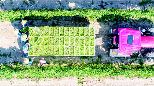 8月12日,采摘工在位于贺兰山东麓银川市西夏区的志辉源石酒庄将酿酒葡萄装车(无人机照片)。