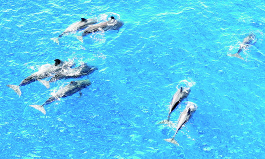 近日,在中国南海出现短肢领航鲸群落。它们三两成群在海面游弋,时而潜入水中嬉戏、时而浮出水面呼气,如海洋精灵般畅游大海。