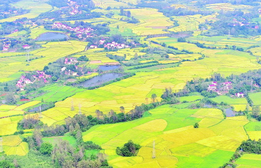 9月8日,裕安区江家店镇一处农田里,次第成熟的水稻如同将大地铺上一层金毯,空中俯瞰,满眼色彩斑斓、生机盎然,“丰”景如画。