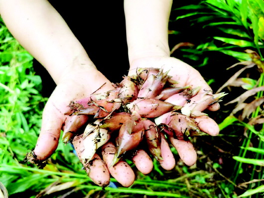 ←图为霍山县佛子岭镇高岭村生态阳荷姜种 植基地“新鲜出土”的阳荷姜。