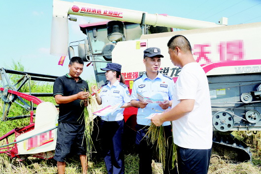 近日,在裕安区江店镇林寨村水稻种植基地,市公安局裕安区江店派出所组织民警辅警,深入田间地头扎实做好“护粮保收”工作,向村民传授防骗反诈知识和技巧,普及涉农安全生产常识,守护好百姓“钱袋子”。