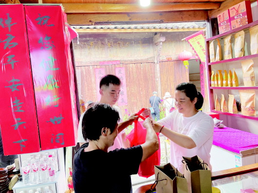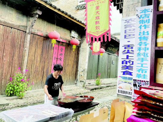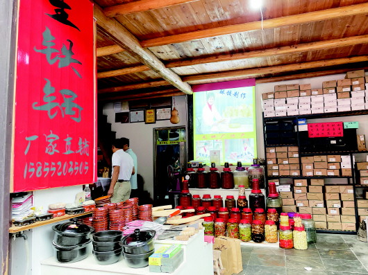 9月15日,在中国历史文化名镇金安区毛坦厂镇明清老街上,61岁的董光珊正在晾晒辣酱、渣肉(米粉肉)。 老街“董大姐酥饺”门店店主董光珊采用传统配方制作的酥饺,香脆可口,远近闻名,被列入市级非遗目录。而她手工酿制的辣酱,以及蒿子粑粑、米粉肉、洋姜豆角辣椒泡菜等具有乡土风味的美食,更是深受来往游客的青睐。 青砖灰瓦石板路,古韵犹存的老街,董大姐独具匠心制作的传统美食香飘四季,为古镇老街增添浓浓的烟火气,勾起无数人的回忆,也缓解无限乡愁。 郑金强 本报记者 徐缓 文/图