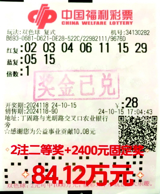 10月15日,双色球2024118期开奖,当期全省中出二等奖2注,均花落我市裕安区丁集镇丁固路与光明路交叉口农业银行旁的第34130282号销售网点。幸运彩民凭借一张28元的双色球复式票,一举拿下二等奖2注,单注奖金419441元,同时还收获四等奖12注,单注奖金200元,总奖金841282元。 第二天一早,幸运彩民便来到市福彩中心办理兑奖手续。据了解,这2注二等奖的得主李先生(化姓)并非资深彩民,而是以平常心对待购彩,偶尔路过福彩网点,心血来潮就会进去买上几注双色球,权当是给自己的一点小期待。李先生回忆他是早上醒来收到手机软件提醒:双色球开奖了,号码为:02、03、04、06、11、15、14,与自己购买的彩票一核对,惊喜地发现除了一个号码不一样,其余完全吻合,“这次中奖的号码,完全是凭感觉选的,没想到竟然这么准,只差一个数字就中了一等奖,但这次二等奖的奖金也相当可观了。”他感慨地说。 对于这笔奖金的规划,李先生展现出了难得的豁达与感恩之心。“这次中奖不仅给我带来了经济方面的帮助,帮我解除了贷款危机,还让我对生活有了更积极的态度,对未来充满了期待。”他表示,自己会继续支持福彩事业,因为每一份购彩都是对公益事业的一份贡献。他希望通过自己的行动,能够为社会传递正能量,帮助更多需要帮助的人。 10月份以来,我市彩市好运连连,继双色球2024114、2024115和2024116连续三期中共出二等奖7注后,时隔一期,本次2024118期再度中出二等奖2注。福彩双色球,始终秉持着“扶老、助残、救孤、济困”的发行宗旨,它不仅仅是一种娱乐方式,更能为生活添彩,为梦想助力。