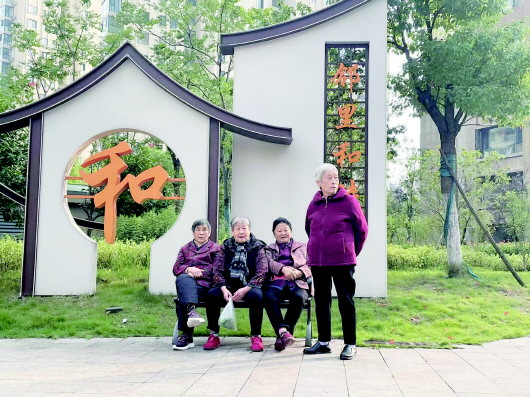 阳光斜照,和美佳苑小区里,几位老人在新置的长凳上休息。
