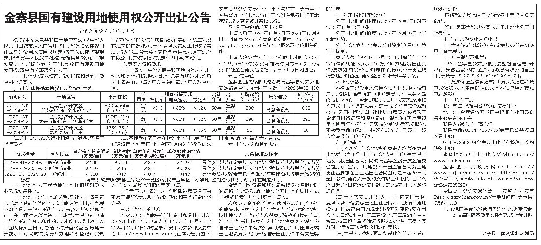 根据《中华人民共和国土地管理法》、《中华人民共和国城市房地产管理法》、《招标拍卖挂牌出让国有建设用地使用权规定》等有关法律法规规定,经金寨县人民政府批准,金寨县自然资源和规划局决定按“标准地”公开出让3宗国有建设用地使用权。现将有关事项公告如下: 一、出让地块基本情况、规划指标和其他主要控制指标要求 (一)出让地块基本情况和规划指标要求 (二)出让地块准入行业和经济、能耗、环境等指标要求 上述地块均为现状净地出让,详细规划要求参见规划条件书。 上述地块土地出让成交后,受让人申请且符合不动产登记条件的,完成土地交付当日,可办理不动产登记并颁发不动产权证书,实现“交地即发证”。在工程建设项目竣工完成后,建设单位申请且符合不动产登记条件的,完成竣工规划核实、竣工验收备案当日,可办结不动产首次登记(房地产开发项目可同时为购房户办理转移登记),实现“交房(验收)即发证”。项目依法结建的人防工程及其独享的口部建筑,土地竞得人在竣工验收备案后,将人防工程无偿移交给金寨县金业资产运营有限公司,并依据相关规定办理不动产登记。 二、竞买人资格要求 (一)申请人为中华人民共和国境内外法人、自然人和其他组织,除法律、法规另有规定外,均可以申请参加,申请人可以单独申请,也可以联合申请。 (二)不接受在我县存在拖欠土地出让金等《国有建设用地使用权出让合同》履约失信行为的法人、自然人或其他组织的竞买申请。 (三)竞买人申请时应提交所缴纳竞买保证金不属于银行贷款、股东借款、转贷和募集资金的承诺书。 三、出让文件的获取 本次公开出让地块的详细资料和具体要求详见公开出让文件。申请人可于2024年11月7日至2024年12月9日17时登录六安市公共资源交易中心(http://ggzy.luan.gov.cn/),在本公告页面(六安市公共资源交易中心—土地与矿产—金寨县—交易查询-本出让公告)左下方附件免费自行下载获取,须认真阅读并遵照执行。 四、保证金缴纳及网上报名 申请人可于2024年11月7日至2024年12月9日17时登录六安市公共资源交易中心(http:// ggzy.luan.gov.cn/)进行网上报名及上传相关附件。 申请人缴纳竞买保证金的截止时间为2024年12月9日17时(以实际到账时间为准),如不成交,保证金在竞买活动结束后5个工作日内退还。 五、资格审查 金寨县自然资源和规划局与金寨县公共资源交易监督管理局会同有关部门于2024年12月10日9时前确认申请人竞买资格。 六、出让方式和其他规定 金寨县自然资源和规划局将根据报名截止时的资格审核情况,确定地块公开出让的具体方式(挂牌或拍卖),并告知所有申请人。 取得竞买资格的竞买人达到3家以上(含3家)的地块,按拍卖方式出让;竞买人不足3家的地块,按挂牌方式出让;无人取得竞买资格的地块,自动终止出让。采用拍卖方式出让地块竞买人须严格遵守出让文件中有关拍卖的规定,采用挂牌方式出让地块竞买人须严格遵守出让文件中有关挂牌的规定。 七、公开出让时间和地点 公开出让时间(挂牌):2024年12月1日8时至2024年12月10日10时。 公开出让时间(拍卖):2024年12月10日上午10时开始。 公开出让地点:金寨县公共资源交易中心第四开标室。 竞买人须于2024年12月10日9时前持保证金银行缴款凭证、公司印章、报名回执码及《出让文件》要求提供的报名资料原件(两份)到公开出让现场办理资料查验、竞买登记、领取号牌等手续。 八、成交规则 本次国有建设用地使用权公开出让地块设有底价,按照价高者得的原则确定受让人,竞买人最终报价必须等于或超过底价,否则不成交。采用拍卖方式出让地块的竞买人进行现场举牌应价或者报价;采用挂牌方式出让地块的竞买人必须采用金寨县自然资源和规划局统一制作的《国有建设用地使用权挂牌出让竞买报价单》进行现场报价,不接受电话、邮寄、口头等方式报价。竞买人一经应价或报价,不可撤回。 九、其他事项 (一)本次公开出让地块的竞得人均须在竞得土地后10个工作日内与出让人签订《国有建设用地使用权出让合同》,同时与金寨经济开发区管委会签订《工业项目用地投入产出监管合同》。土地出让金要求在自土地出让合同签订之日起30日内全部缴清,竞得人未按时支付以上价款的,自滞纳之日起,每日按迟延支付款项的1‰向出让人缴纳违约金。 (二)土地成交后,出让人一个月内交付土地。竞得人要严格按照土地出让合同和工业项目用地投入产出监管合同的规定进行开发建设;要在自交地之日起3个月内开工建设,在开工后24个月内竣工,竣工投产后初始运行期为24个月;竞得人要及时申请竣工联合验收和达产复核。 (三)竞得人必须按照规划设计条件要求进行规划和建设。 (四)契税及其他应征收的税费由竞得人负责缴纳。 (五)未尽事宜和具体要求详见本地块公开出让须知。 十、保证金缴纳账户及账号 (一)竞买保证金缴纳账户:金寨县公共资源交易监督管理局 (二)开户银行及账号: [户名:金寨县公共资源交易监督管理局;开户行:安徽金寨农村商业银行股份有限公司营业部;子账号:20000278890666600005707]。 (三)竞买保证金缴款方式:由竞买人通过转账方式缴款(法人申请的从法人基本账户通过转账方式缴款)。 十一、联系方式 联系单位:金寨县公共资源交易中心 地 址:金寨经济开发区金梧桐创业