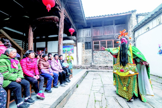 12月25日,郑店村婺剧坐唱班的演员在村文化礼堂为村民们演出婺剧《关羽探营》。 临近春节,金华市金东区澧浦镇郑店村婺剧坐唱班的演员在村文化礼堂为村民开展迎新春婺剧系列表演,吸引了不少村民前来观看。 从12月份开始,浙江省金华市金东区20多个民间剧团迎来了迎新春演出旺季。金华市金东区是婺剧之乡,婺剧表演有着深厚的历史渊源和广泛的群众基础。近年来该区积极推进“婺剧+文化礼堂”艺术普及模式,开展戏曲艺术培训、婺剧精品剧目展演、婺剧艺术扶植基地创建等品牌打造行动,推进地方传统戏剧传承和发扬。目前全区活跃着大大小小28个婺剧民间剧团(社),拥有澧浦郑店、任宅前等12个区级婺剧特色村,还涌现了婺之灵坐唱班、琴艺剧团等一批由婺剧爱好者自发组织的民间剧团。 新华社记者 徐昱 摄