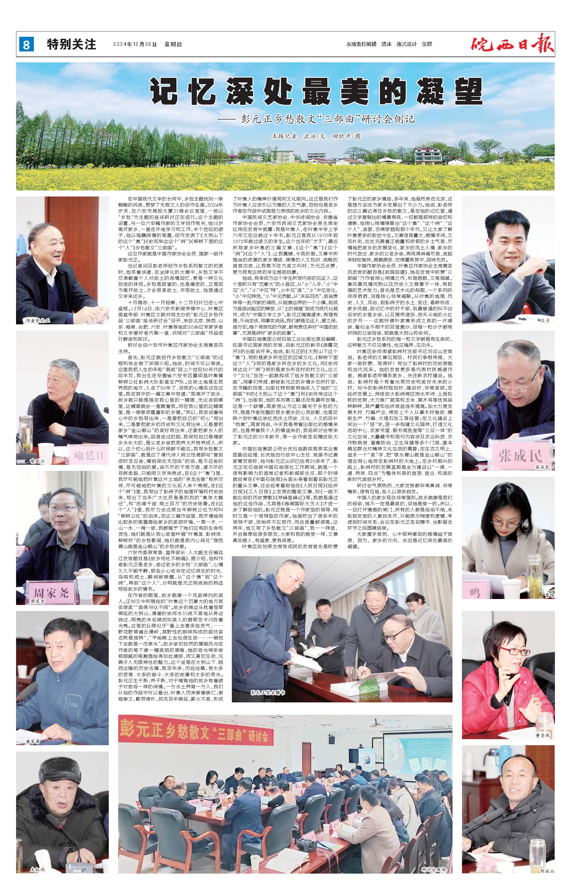 在中国现代文学的长河中,乡愁主题犹如一条蜿蜒的河流,贯穿了无数文人的创作生涯。2024年岁末,在六安市城投大厦21楼会议室里,一场以“乡愁”为主题的座谈研讨正在进行。这个主题的设置,与一位六安籍作家的文学创作有关,他16岁离开家乡,一直在外地学习和工作,半个世纪的游子,他以饱蘸深情的笔墨,创作发表了《大别山下的这个“集”》《史河岸边这个“洲”》《柳树下面的这个“人”》乡愁散文“三部曲”。 这位作家就是中国作家协会会员、国家一级作家彭元正。 当记者问及彭老师创作乡愁系列散文的初衷时,他笑着谈道,在全球化的大潮中,乡愁文学不仅承载着个人对故土的深情回忆,更是一种文化自觉的体现。乡愁是甜蜜的,也是痛苦的,正是因为离开故土,才会思索故土、书写故土,他想通过文学来还乡。 十月微凉,十一月轻寒,十二月归计已在心中盘桓。12月14日,由六安市新闻传媒中心、叶集区委宣传部、叶集区文联共同主办的“彭元正乡愁作品‘三部曲’座谈研讨会”召开,来自北京、陕西、山东、海南、合肥、六安、叶集等地的30余位专家学者和文学爱好者齐聚一堂,共同对“三部曲”作品进行解读和探讨。 研讨会由六安市叶集区作家协会主席黄圣凤主持。 首先,彭元正就创作乡愁散文“三部曲”的过程和体会做了详细介绍。他说,时间不可以倒流。这里我把人生的年轮“倒流”回上个世纪50年代的后半页,我出生在安徽省六安专区霍邱县叶集镇柳树公社彭洲大队彭堂生产队。这块土地是生我养我的地方,人走了50年了,但我的心确实还在这里。我在其中的一篇文章中写道:“我离开了故乡,故乡就只能是挂在我心里的一幅画,无论走到哪里,这幅画就会一直跟着我。而在我心里的这幅画里,是一缕缕浓墨重彩的乡情。”所以,我尝试着将心中的乡愁写出来,一是要把自己的“初心”写出来,二是要把家乡的历史和文化写出来,三是要把家乡“金山银山”的美好写出来,还要把家乡人的精气神写出来。回首走过的路,我深知自己是喝家乡水长大的,是父老乡亲把我养大并培养成人,所以,这个初心到什么时候都不能忘。我写乡愁散文“三部曲”,就是应了清代诗人纳兰性德那句“意到浓时怎忍舍,情到深处无怨由”的话,是不忍舍的情,是无怨由的爱。说不尽的千言万语,道不尽的百转柔肠,只能用文字来表述。在《这个“集”》里,我尽可能地把叶集这片土地的“来龙去脉”有所交待,尽可能地把叶集的文化名人来个亮相。在《这个“洲”》里,我写出了彭洲子的地理环境和村史由来,写出了当年广大社员轰轰烈烈的“集体大搬迁”,和“改滩千亩、换土百万”的历史场景。在《这个“人”》里,我尽力去还原当年柳树公社为何叫“柳树公社”的由来。在这三篇作品里,我尽情地用比较多的笔墨描绘家乡的美丽环境,一草一木、一山一水、一湾一坡,我都赋予了她们应有的生命和灵性,她们就是从我心底里吟唱“叶集美、彭洲俏、柳树好”的乡愁歌谣,她们就是我内心深处“绿色青山就是金山银山”的乡愁诗意。 六安市委原常委、宣传部长、人大副主任喻廷江发言题目是《故乡何处不销魂》,据介绍,他和作者彭元正是老乡,读过老乡的乡愁“三部曲”,心情久久不能平静,那些小心收存在记忆深处的时光、鸟鸣和泥土,瞬间被唤醒,从“这个集”到“这个洲”,再到“这个人”,分明就是元正用流淌的热血写给故乡的情书。 在作者的眼里,故乡就像一个风姿绰约的美人。正如文中所描绘的“叶集这个巴掌大的地方其实很美”“美得与众不同”。故乡的南边头枕着苍翠绵延的大别山,清澈的史河水川流不息地从身边淌过,明亮的未名湖犹如美人的翡翠发卡闪烁着光亮。这里的丘陵似乎“看上去要多些灵气,……野花野草遍丘漫岭,其野性的韵味构成的起伏姿态煞是独特”,“平地瞅上去也很生动……一锹挖下去就是一汪泉水”。故乡亲切自然的旖旎风光在作者的笔下像一幅美丽的画卷,她的容光神采被那细腻的笔触描绘得如此清丽,而又真切生动,充满令人无限神往的魅力。这个坐落在大别山下、皖西边陲的历史古镇,数百年来,历经沧桑,有太多的苦难、太多的奋斗、太多的故事和太多的荣光。彭元正生于斯,养于斯,对于哺育他的故乡有着游子对慈母一样的深情。一方水土养育一方人,我们从他的作品中可以看出,叶集人历来崇善崇仁,崇商崇文,勤劳淳朴,民风百年绵延,薪火不息,形成了叶集人的精神价值观和文化取向。这正是我们作为叶集人应该引以为傲的人文气象,恐怕也是老乡作者在作品中试图极力表现的故乡的文化内核。 中国民间文艺家协会、中华诗词协会、安徽省作家协会会员,六安市民间文艺家协会原主席史红雨在发言中披露:我是叶集人,在叶集中学上学六年又在这教过十年书。彭元正是我从1970年到1972年教过语文的学生。这个当年的“才子”,最近所写家乡叶集的三篇文章,《这个“集”》《这个“洲”》《这个“人”》,让我震撼,令我折服。文章中所饱含的浓厚的家乡情结、渊博的人文知识、流畅的语言功底,让我禁不住为美文叫好,为元正点赞,更为我有这样的学生感到自豪。 他说,有幸成为这个学生所写内容的见证人,这个面积只有“巴掌大”的小县区,从“小”入手,“小”中见“大”,“小”中见“特”,小中见“美”,“小”