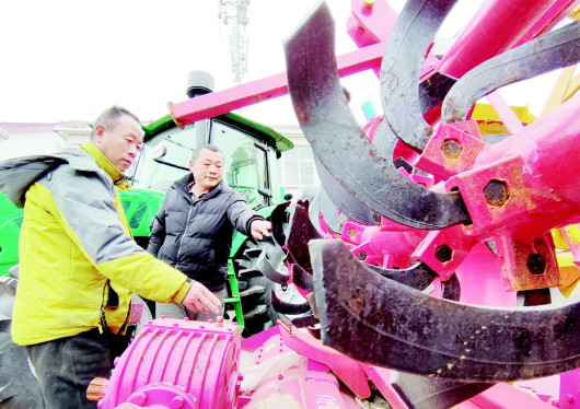 2月11日,金安区城北镇街道常发农装销售服务中心,来自裕安区新安镇的种粮大户(左一)正在选购农机设备。