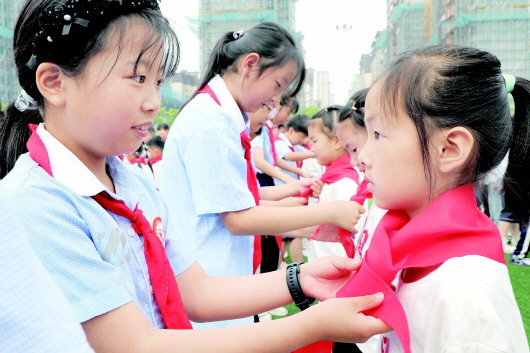 图为5月28日,金安区人民路小学安丰路校区少先大队队员为新加入中国少年先锋队的小朋友佩戴红领巾。