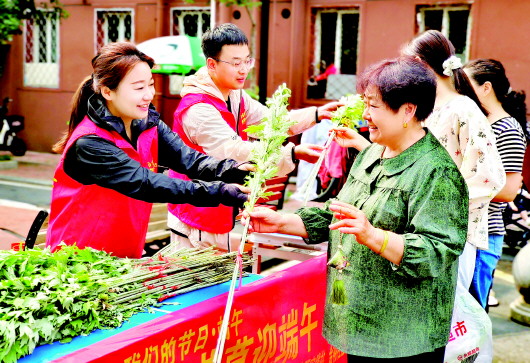 5月28日,金安区三里桥街道金裕社区新时代文明实践站联合社区工会、妇联、团支部、关工委,在辖区无物业小区开展“我们的节日·端午——悠悠艾草迎端午 情意绵绵送安康”主题活动。现场通过投壶游戏重现传统民俗趣味,志愿者为居民赠送艾草、香囊传递安康祝福,并发放安全生产和防溺水知识宣传单。活动让居民亲身感受传统文化魅力,真切体会社区“有心”“有爱”“有温度”的关怀。 卢煜 本报记者 袁洁 摄