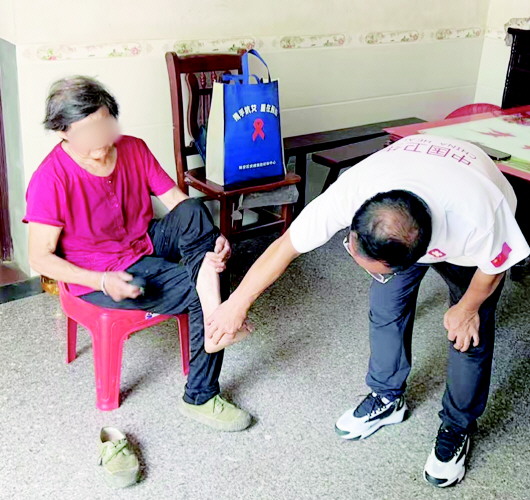 图为市疾控中心麻风病防治专家为老人检查。