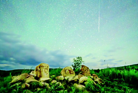 7月31日在黑龙江省哈尔滨市依兰县陨石坑拍摄的流星雨(长时间曝光拍摄)。