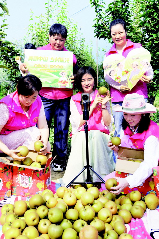 图为8月5日志愿者们在梨园通过抖音直播介绍梨子品质。
