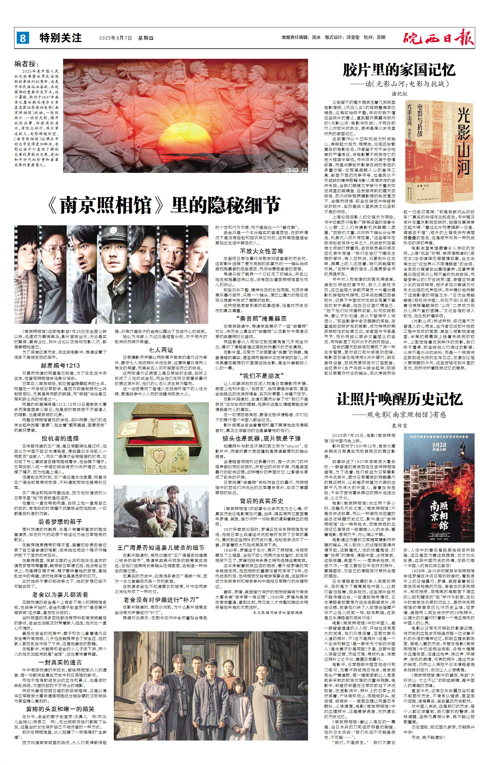 编者按: 2025年是中国人民抗日战争暨世界反法西斯战争胜利80周年,这是中华民族浴血奋战、共赴国难的重要历史节点。这个暑期,取材于1937年南京大屠杀期间侵华日军真实罪证影像的电影《南京照相馆》热映,一张张照片、一帧帧光影,揭开抗战往事,传递深刻启示。有观众评价,照片穿过战火,电影跨越时空,《南京照相馆》让课本中的文字变得更加鲜活,电影让孩子们直观了解到先辈的勇敢与无畏,更知和平时代的珍贵和吾辈自强的重要意义。 《南京照相馆》这部电影自7月25日在全国公映以来,迅速成为票房黑马。影片首映当天,无论是实时票房、票房占比、排片占比以及场均观影人次,都居暑期档首位。 为了深度还原历史,在这部电影中,导演设置了很多不易被发现的细节。 邮差编号1213 刘昊然饰演的阿昌是位邮差,为了在乱世中求生存,他冒用照相馆学徒身份保命。 日军攻入南京城后,到处搜查隐藏起来的士兵。阿昌在一开场被日军射杀,是因为邮差制服和士兵制服相似,尤其是有同款的绑腿,而“绑腿”恰恰是日军判断士兵的标准之一。 阿昌的邮差编号是1213,12月13日是南京大屠杀死难者国家公祭日。他是彼时南京城千万普通人的缩影,也是南京城的化身。 阿昌在照相馆冒充的学徒,名叫阿泰,他们的名字合起来就是“昌泰”,包含着“繁荣昌盛,国泰民安”的美好愿景。 投机者的选择 王传君饰演的王广海,是日军翻译也是汉奸,他自认为中国不敌日本侵略者,便投靠日本与敌人一同欺负“自家人”。而王广海偶尔会有摇摆的时候,比如做了亏心事或者目睹同胞被屠杀,他会摘下帽子。日军说到八纮一宇塔的砖块有苏州河护堤石,他也摘了帽子,因为他是上海人。 但遇到生死时刻,王广海还是本性显露,阿昌与王广海去邮局寻找物资,不料遇到同样在搜寻的日军。 王广海当即抛弃阿昌逃走,因为他知道彼时从日军手里“抢”物资就是在送死。 他看似一直在帮助阿昌,实际上他一直有自己的目的,有危险的时候毫不犹豫就会把他抛弃,一切都是投机者的伪装。 装着梦想的箱子 高叶饰演的林毓秀,本是个有着明星梦的跑龙套演员,却在时代的动荡下被迫沦为给日军赔笑的歌女。 在毓秀随身携带的箱子里,装着的珍贵胶卷记录了自己曾参演的电影,后来她也用这个箱子作掩护救下了受伤的宋班长。 在毓秀眼里,保家卫国的士兵和她毕生追求的演员梦想同等重要。毓秀被日军侵犯后,她没有坐在床上,而是蹲在箱子旁,箱子意味着她的梦想,是她乱世中的希望,彼时她哭得也是演员梦的幻灭。 此时她终于意识到战争之下,她的梦想已经不可能实现了。 老金以为妻儿都活着 王骁饰演的老金是个上有老下有小的照相馆老板,在战争开始时,老金和妻子赵宜芳对“是否离开南京城"这件事,是存在分歧的。 当时城里的很多百姓都没有预料到南京城最后的惨状,老金也没能及时带着家人逃走,他对此一直心怀愧疚。 最后在老金的视角中,妻子和女儿拿着通行证安全离开南京城,儿子也由毓秀带去了安全区,他的家人都在乱世中活了下来,这是他最后的慰藉。 在电影中,林毓秀和老金的小儿子活下来,两个人的姓氏加起来就是“金陵”,这也意味着希望。 一封真实的遗言 片中周游饰演的宋班长,留给照相馆众人的遗言,每一句都来自真实历史中抗日英雄的家书。 而他于危难前迸发出的血性和勇义,也是彼时奔赴战场,为国抗敌的千万将士的缩影。 宋班长最后怒砸日寇的那块城墙砖,正是以侵华日军南京大屠杀遇难同胞纪念馆珍藏的文物砖块为原型精心复刻的。 剪短的头发和唯一的微笑 在片中,老金的妻子赵宜芳(王真儿 饰)和女儿金婉仪(杨恩又 饰),在出城前夜她们都剪了头发,这是当时女性保护自己不被伤害的一种方式。 那天在照相馆里,众人拍摄了一张难得的“全家福”。 因为知道南京城里的战况,大人们笑得都很勉强,只有仍是孩子的金婉仪露出了发自内心的微笑。 她认为与家人不过只是短暂分别,对于明天的到来依然满怀希望。 七人两证 日军摄影师伊藤以两张离开南京的通行证为条件,要求七人完成照片冲洗任务,这意味着只有两人有生的希望,而其余五人则可能面临死亡的命运。 这两张通行证表面上是日军给的生路,实际上却成了人性的试金石。而当他们发现日军屠杀暴行的罪证底片时,他们的心态从求生转为誓死。 这一设定展现了普通人在极端环境下的人性光辉,更是战争中小人物的觉醒与民族大义。 王广海是否知道妻儿被杀的细节 在影片路演时,有观众提问“王广海是否知道妻儿被杀的细节”,导演申奥表示现场的距离其实很远,但他们选择用长焦镜头压缩画面,去制造一种命运的错位感。 在真实的历史中,还有很多像王广海家一样,因为一念之差最后天各一方的家庭。 这就像老金也不知道妻女的结局,片中这两家之间也形成了一种对仗。 老金没有对伊藤进行“补刀” 在影片路演时,有观众问到,为什么影片结尾老金没有对伊藤进行“补刀”。 导演对此表示,在剧本创作中会尽量贴合角色的个性和行为习惯,而不是给出一个“最优解”。 老金只是一个本分踏实的普通百姓,在那种情况下是没有经验和胆识来应对的,这种角色塑造会更贴近生活中鲜活的人。 不放大女性苦难 在呈现日军性暴行与慰安妇受害者的历史时,这部影片选择了更为克制的叙事方式——