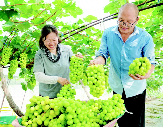 8月7日,果农在江苏省海安市白甸镇春园家庭农场葡萄园采摘葡萄。