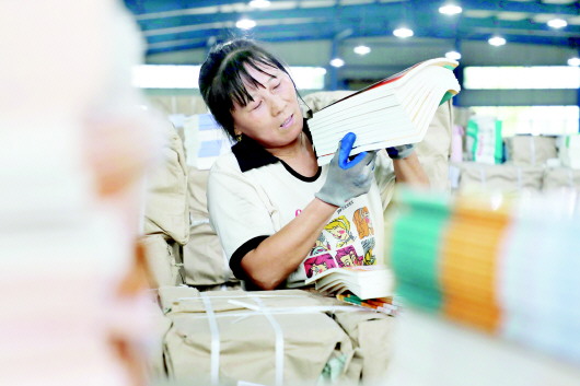 8月12日,市新华书店教材仓库内,工人正在搬运整理新学期教材。