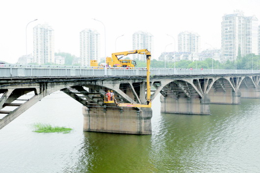 8月13日,在六安城区云露桥上,工人在对桥梁质量进行检测,排查安全隐患。 据了解,从7月20日起,我市相关部门对横跨六安城区和月亮岛的云露桥行车道进行为期30天的养护封闭施工,目前已完成桥面人行道面砖更换铺设、桥面及伸缩缝维修等施工,现正进行桥梁检测、维护及巡查以及车行道沥青摊铺等作业,确保按期完工,提升市民出行体验。 本报记者 田凯平 摄