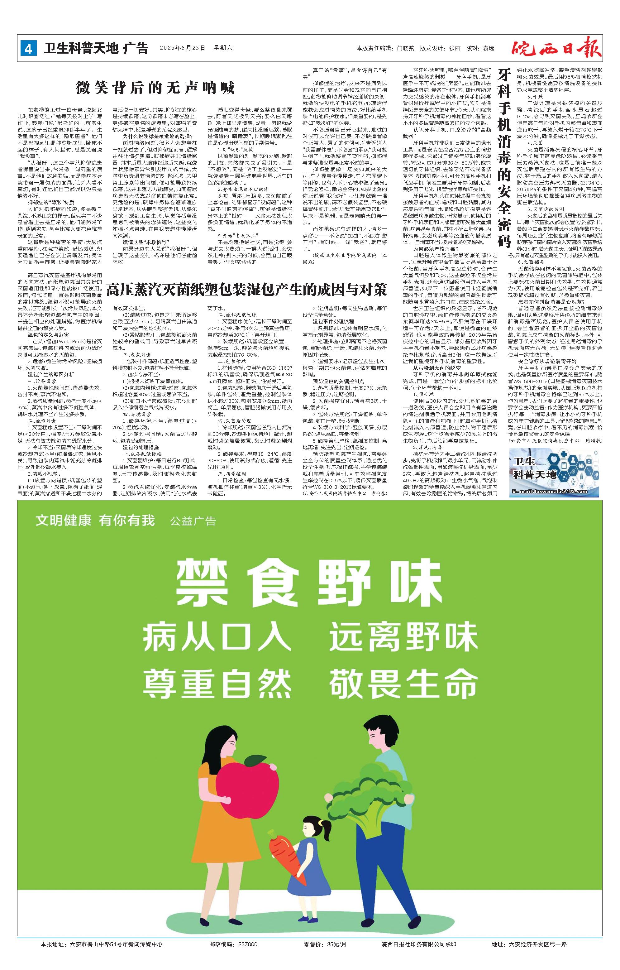在牙科诊所里,那台伴随着“滋滋”声高速旋转的器械——牙科手机,是牙医手中不可或缺的“武器”。它能精准去除龋坏组织、制备牙体形态,却也可能成为交叉感染的潜在载体。牙科手机消毒看似是诊疗流程中的小细节,实则是保障医患安全的关键环节。今天,我们就来揭开牙科手机消毒的神秘面纱,看看这小小的器械背后藏着怎样的安全密码。 认识牙科手机:口腔诊疗的“高频武器” 牙科手机并非我们日常使用的通讯工具,而是安装在综合治疗台上的精密医疗器械。它通过压缩空气驱动涡轮旋转,转速可达每分钟30万-50万转,能快速切割牙体组织、去除牙结石或制备修复体。根据功能不同,可分为高速手机和低速手机,前者主要用于牙体切割,后者则多用于抛光、根管治疗等精细操作。 牙科手机机头在使用过程中会直接接触患者的血液、唾液和口腔黏膜,其内部复杂的气道、水道和涡轮结构更是容易藏匿病原微生物。研究显示,使用后的牙科手机表面和内部管道可残留大量细菌、病毒甚至真菌,其中不乏乙肝病毒、丙肝病毒、艾滋病病毒等经血液传播病原体,一旦消毒不当,极易造成交叉感染。 为何必须严格消毒? 口腔是人体微生物最密集的部位之一,每毫升唾液中含有数百万甚至数千万个细菌。当牙科手机高速旋转时,会产生大量气溶胶和飞沫,这些微粒不仅会污染手机表面,还会通过回吸作用进入手机内部管道。如果下一位患者使用未经彻底消毒的手机,管道内残留的病原微生物就可能随着水雾喷入其口腔,造成感染风险。 世界卫生组织的数据显示,在不规范的口腔诊疗中,经血液传播疾病的交叉感染概率可达3%-5%。乙肝病毒在干燥环境中可存活7天以上,即使是微量的血液残留,也可能导致病毒传播。2019年某省疾控中心的调查显示,部分基层诊所因牙科手机消毒不规范,导致患者乙肝病毒感染率比规范诊所高出3倍,这一数据足以让我们重视牙科手机消毒的重要性。 从污染到无菌的蜕变 牙科手机的消毒并非简单擦拭就能完成,而是一套包含6个步骤的标准化流程,每个环节都缺一不可。 1、预处理 使用后30秒内的预处理是消毒的第一道防线。医护人员会立即用含有蛋白酶的清洁剂喷洒手机表面,并用专用毛刷清除可见的血液和唾液,同时启动手机让清洁剂流入内部管道,防止污染物干涸后形成生物膜。这个步骤能减少70%以上的微生物负荷,为后续消毒奠定基础。 2、清洗、消毒 清洗环节分为手工清洗和机械清洗两步。先将手机拆解到最小单元,用流动水冲洗各部件表面,用酶液擦洗机身表面,至少2次,再放入超声清洗机。超声清洗通过40kHz的高频振动产生微小气泡,气泡破裂时释放的能量能深入手机缝隙和管道内部,有效去除隐匿的污染物。清洗后必须用纯化水彻底冲洗,避免清洁剂残留影响灭菌效果。最后用95%酒精擦拭机身。机械清洗需要按清洗设备的操作要求完成整个清洗程序。 3、干燥 干燥处理是常被忽视的关键步骤。清洗后的手机含水量若超过0.2%,会导致灭菌失败。正规诊所会使用高压气枪对手机内部管道和表面进行吹干,再放入烘干箱在70℃下干燥20分钟,确保器械处于干燥状态。 4、灭菌 灭菌是消毒流程的核心环节。牙科手机属于高度危险器械,必须采用压力蒸汽灭菌法,这是目前唯一能杀灭包括芽孢在内的所有微生物的方法。将干燥后的手机放入灭菌袋,装入脉动真空压力蒸汽灭菌器,在134℃、205kPa的条件下灭菌4分钟,高温高压环境能彻底摧毁各类病原微生物的蛋白质结构。 5、灭菌后的监测 灭菌后的监测是质量把控的最后关口。每个灭菌批次都会放置化学指示卡,若颜色由蓝变黑则表示灭菌参数达标;每周还会进行生物监测,将含有嗜热脂肪芽孢杆菌的菌片放入灭菌器,灭菌后培养48小时,若无菌生长则证明灭菌效果合格。只有通过双重监测的手机才能投入使用。 6、无菌储存 无菌储存同样不容忽视。灭菌合格的手机需存放在密闭的无菌储物柜中,包装上要标注灭菌日期和失效期,有效期通常为7天。使用前需检查包装是否完好,若出现破损或超过有效期,必须重新灭菌。 患者如何判断消毒是否规范? 普通患者虽然无法直接检测消毒效果,但可以通过观察牙科诊所的细节来判断消毒是否规范。医护人员在使用手机前,会当着患者的面拆开全新的灭菌包装,包装上应有清晰的灭菌标识。另外,可留意手机的外观状态,经过规范消毒的手机表面应无污渍、无划痕,连接管线时会使用一次性防护套。 安全诊疗从规范消毒开始 牙科手机消毒是口腔诊疗安全的底线,也是衡量诊所医疗质量的重要标准。随着WS 506-2016《口腔器械消毒灭菌技术操作规范》的全面实施,我国正规医疗机构的牙科手机消毒合格率已达到95%以上。作为患者,我们既要了解消毒的重要性,也要学会主动监督;作为医疗机构,更要严格执行每一个消毒步骤,让小小的牙科手机成为守护健康的工具,而非感染的隐患。毕竟,在口腔诊疗中,看不见的消毒流程,恰恰是最该被看见的安全保障。 (六安市人民医院消毒供应中心 周增敏)