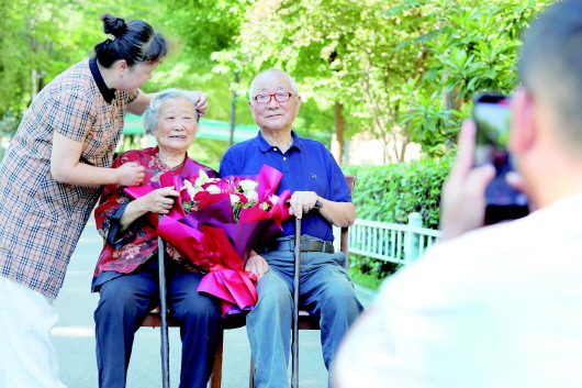 图为社区志愿者在为金婚夫妻拍摄合影。 本报记者 田凯平 摄