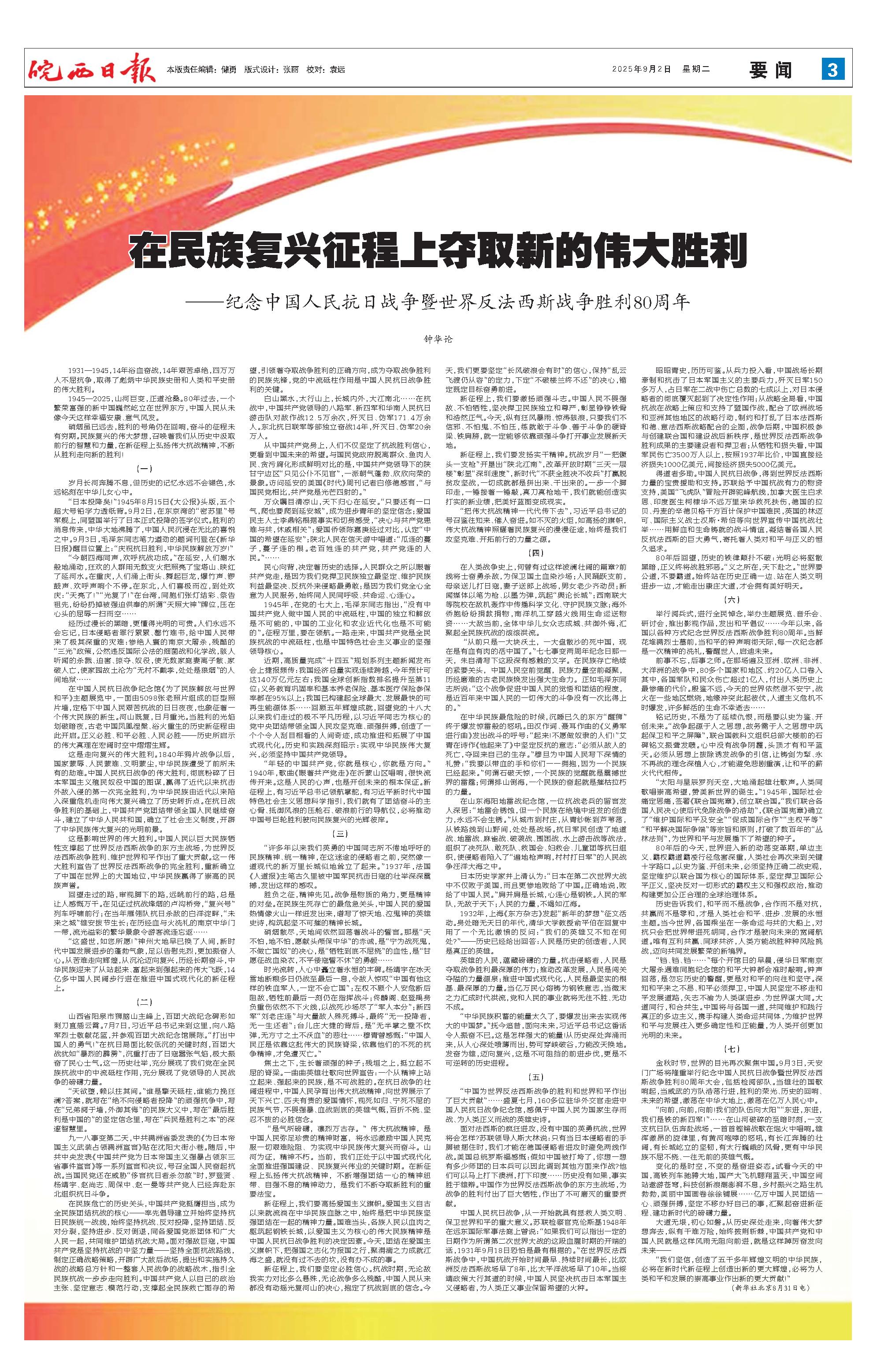 1931—1945,14年浴血奋战,14年艰苦卓绝,四万万人不屈抗争,取得了彪炳中华民族史册和人类和平史册的伟大胜利。 1945—2025,山河巨变,正道沧桑。80年过去,一个繁荣富强的新中国巍然屹立在世界东方,中国人民从未像今天这样幸福安康、意气风发。 硝烟虽已远去,胜利的号角仍在回响,奋斗的征程未有穷期。民族复兴的伟大梦想,召唤着我们从历史中汲取前行的智慧和力量,在新征程上弘扬伟大抗战精神,不断从胜利走向新的胜利! (一) 岁月长河奔腾不息,但历史的记忆永远不会褪色,永远铭刻在中华儿女心中。 “日本投降矣!”1945年8月15日《大公报》头版,五个超大号铅字力透纸背。9月2日,在东京湾的“密苏里”号军舰上,同盟国举行了日本正式投降的签字仪式。胜利的消息传来,中华大地沸腾了,中国人民沉浸在无比的喜悦之中。9月3日,毛泽东同志笔力遒劲的题词刊登在《新华日报》醒目位置上:“庆祝抗日胜利,中华民族解放万岁!” “今朝四海同声,欢呼抗战功成。”在延安,人们潮水般地涌动,狂欢的人群用无数支火把照亮了宝塔山、映红了延河水。在重庆,人们涌上街头、舞起巨龙,爆竹声、锣鼓声、欢呼声响个不停。在东北,人们喜极而泣,到处欢庆:“天亮了!”“光复了!”在台湾,同胞们张灯结彩、祭告祖先,纷纷扔掉被强迫供奉的所谓“天照大神”牌位,压在心头的屈辱一扫而空…… 经历过漫长的黑暗,更懂得光明的可贵。人们永远不会忘记,日本侵略者罪行累累、罄竹难书,给中国人民带来了极其深重的灾难:惨绝人寰的南京大屠杀,残酷的“三光”政策,公然违反国际公法的细菌战和化学战,骇人听闻的杀戮、迫害、掠夺、奴役,使无数家庭妻离子散、家破人亡,使家园故土沦为“无村不戴孝,处处是狼烟”的人间地狱…… 在中国人民抗日战争纪念馆《为了民族解放与世界和平》主题展览中,一面由5098张老照片组成的巨型照片墙,定格下中国人民艰苦抗战的日日夜夜,也象征着一个伟大民族的新生。河山既复,日月重光。当胜利的光焰划破暗夜,古老中国凤凰涅槃、浴火重生的历史新征程由此开启。正义必胜、和平必胜、人民必胜——历史所启示的伟大真理在宏阔时空中熠熠生辉。 这是走向复兴的伟大胜利。1840年鸦片战争以后,国家蒙辱、人民蒙难、文明蒙尘,中华民族遭受了前所未有的劫难。中国人民抗日战争的伟大胜利,彻底粉碎了日本军国主义殖民奴役中国的图谋,赢得了近代以来抗击外敌入侵的第一次完全胜利,为中华民族由近代以来陷入深重危机走向伟大复兴确立了历史转折点。在抗日战争胜利的基础上,中国共产党团结带领全国人民继续奋斗,建立了中华人民共和国,确立了社会主义制度,开辟了中华民族伟大复兴的光明前景。 这是影响世界的伟大胜利。中国人民以巨大民族牺牲支撑起了世界反法西斯战争的东方主战场,为世界反法西斯战争胜利、维护世界和平作出了重大贡献。这一伟大胜利宣告了世界反法西斯战争的完全胜利,重新确立了中国在世界上的大国地位,中华民族赢得了崇高的民族声誉。 回望走过的路,审视脚下的路,远眺前行的路,总是让人感慨万千。在见证过抗战烽烟的卢沟桥旁,“复兴号”列车呼啸前行;在当年雁翎队抗日杀敌的白洋淀畔,“未来之城”雄安拔节生长;在历经血与火洗礼的南京中华门一带,流光溢彩的繁华景象令游客流连忘返…… “这盛世,如您所愿!”神州大地早已换了人间,新时代中国发展进步的蓬勃气象,足以告慰先烈,更加振奋人心。从苦难走向辉煌,从沉沦迈向复兴,历经长期奋斗,中华民族迎来了从站起来、富起来到强起来的伟大飞跃,14亿多中国人民阔步行进在推进中国式现代化的新征程上。 (二) 山西省阳泉市狮脑山主峰上,百团大战纪念碑形如刺刀直插云霄。7月7日,习近平总书记来到这里,向八路军烈士敬献花篮,并参观百团大战纪念馆展陈。“打出中国人的勇气!”在抗日局面比较低沉的关键时刻,百团大战犹如“暴烈的霹雳”,沉重打击了日寇嚣张气焰,极大振奋了民心士气。这一历史壮举,充分展现了我们党在全民族抗战中的中流砥柱作用,充分展现了党领导的人民战争的磅礴力量。 “天欲堕,赖以拄其间。”谁是擎天砥柱,谁能力挽狂澜?答案,就写在“绝不向侵略者投降”的顽强抗争中,写在“兄弟阋于墙,外御其侮”的民族大义中,写在“最后胜利是中国的”的坚定信念里,写在“兵民是胜利之本”的深邃智慧里。 九一八事变第二天,中共满洲省委发表的《为日本帝国主义武装占领满洲宣言》贴在沈阳大街小巷。随后,中共中央发表《中国共产党为日本帝国主义强暴占领东三省事件宣言》等一系列宣言和决议,号召全国人民奋起抗战。当国民党还在威胁“侈言抗日者杀勿赦”时,罗登贤、杨靖宇、赵尚志、周保中、赵一曼等共产党人已经奔赴东北组织抗日斗争。 在民族危亡的历史关头,中国共产党挺膺担当,成为全民族团结抗战的核心——率先倡导建立并始终坚持抗日民族统一战线,始终坚持抗战、反对投降,坚持团结、反对分裂,坚持进步、反对倒退,同各爱国党派团体和广大人民一起,共同维护团结抗战大局。面对强敌巨寇,中国共产党是坚持抗战的中坚力量——坚持全面抗战路线,制定正确战略策略,开辟广大敌后战场,提出和实施持久战的战略总方针和一整套人民战争的战略战术,