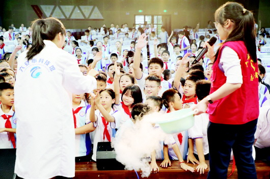 今年9月是首个全国科普月,9月4日,市科技馆联合裕安区紫荆小学围绕“科技改变生活 创新赢得未来”主题开展科普宣教进校园活动,通过科学讲座、科普剧表演、魔法实验室及丰富多彩的科学体验和互动项目等形式,带领同学们开启一场沉浸式的科学探索之旅,感受科技的魅力,激发大家对科学探索、科技创新的浓厚兴趣。 图为裕安区紫荆小学的同学们积极与六安市科技馆科普志愿者互动,进行“神奇的液氮”科学实验。 本报记者 田凯平 摄