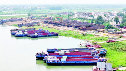 8月26日,在河南信阳淮滨县十里造船产业带,宽阔的水面停满各色船舶,岸边造船设施林立,尽显造船产业蓬勃活力。 (图片来源 蚌埠日报提供)