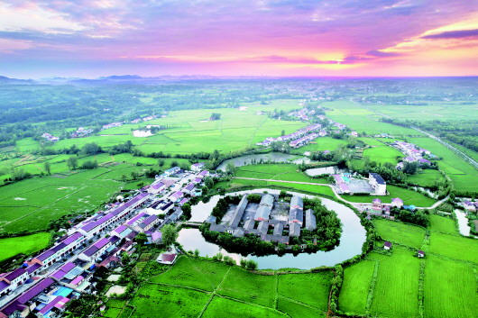 有“江淮第一水圩”美誉的刘大圩庄园位于金安区张店镇东部,是清代淮军著名将领、首任台湾巡抚刘铭传的故居之一。 据有关资料记载:庄园总占地约50万平方米,建筑面积约10万平方米,现场观察现存数百间老宅,有上万平米。原建有内外两道水圩,四面环水,为江淮地区规模最大、规格最高的一方名圩,虽历经百余年风雨沧桑,依然古韵犹存,现存有四面环水的内圩、古朴典雅的石桥、古色古香的绣花楼以及大量花雕木刻的古建筑,散发着皖风徽韵的独特魅力。 盛夏时节,我从六安市区驱车30多公里,走进绿意盎然的乡村田园,走进绿水环绕、古色古香的刘大圩庄园,探寻气势宏伟、远近闻名的古建筑群之美。 在一幢幢农民新居中有几间老屋格外显眼,从老屋门楼穿过,便是刘大圩庄园。走过约20米长的石桥,步入敞亮的院落,一排排青砖灰瓦、木梁石柱的老宅错落有致,空旷的庄园寂静无声,偶有鸟儿飞过,仿佛时光静止一般。遥想当年,这里是何等的气派与热闹? 据当地老人介绍,刘铭传倾毕生心血,建了三座刘家圩子,分别是在合肥肥西县的刘老圩子,在六安张店的刘大圩子和在金寨县原麻埠镇的刘新圩子,1891年辞官后他往来于三地居住。目前,肥西的刘老圩子已经得到很好的保护和开发,金寨的刘新圩子淹没在水库下面。 张店的刘大圩子原先共有九进,以砖、木、石为原料,以木构架为主,每间四梁八柱,雕梁画栋,屋顶、檐口装饰精美。刘大圩当初有内中外三重圩子,两道壕沟,三座门楼,号称“三道闸”,既防盗贼又防土匪,易守难攻。 岁月悠悠,历经百余年风雨沧桑的刘大圩庄园,虽无昔日的辉煌,但依然古韵犹存,大门楼、绣花楼、露台、后花园以及石桥等建筑基本保留完整,令人欣慰。特别是被列入安徽省重点文物保护单位后,现存的古建筑得到修缮保护,同时,随着当地文旅事业的发展,刘大圩庄园已成为金安区“九十里山水画廊”的一个重要旅游景点,吸引了四方游客。 黄昏时分,夕阳西下,我放飞无人机,空中俯瞰刘大圩庄园,绿水环绕的中央,十几栋数百间老宅尽收眼底,在绿树碧水的映衬下格外古朴典雅,气派非凡。