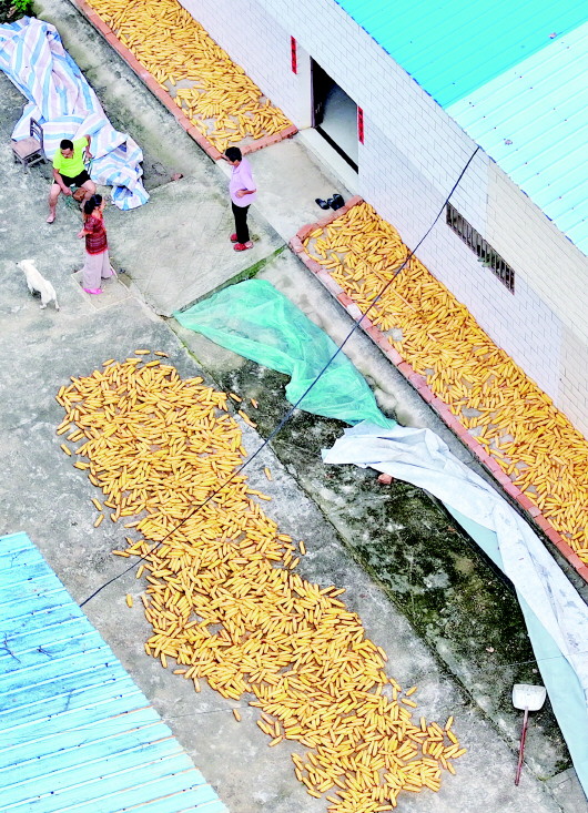 9月16日,裕安区城南镇关王庙村一处农家小院里,小憩的农民与晾晒的玉米相映成景,构成一幅自然和谐的乡村图景。