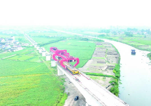 中铁十一局新建沪宁合高铁沪宁段通泰扬特大桥箱梁架设现场(9月24日摄,无人机照片)。 近日,中铁十一局新建上海至南京至合肥高速铁路沪宁段站前9标箱梁架设现场一派繁忙,施工人员抢抓工期,全力推进工程建设。据悉,截至目前,该标段已架设箱梁708榀,完成架梁任务的83%。 新建上海至南京至合肥高速铁路是国家中长期铁路网规划“八纵八横”中沿江通道的重要组成部分,是江北沿江城市与南京都市圈、上海都市圈快速直达的快捷通道,承担沿江通道主要路网客流、沿海及京沪通道部分直通上海客流的运输。 新华社记者 季春鹏 摄
