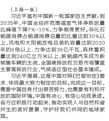 (上接一版) 习近平宣布中国新一轮国家自主贡献:到2035年,中国全经济范围温室气体净排放量比峰值下降7%-10%,力争做得更好。非化石能源消费占能源消费总量的比重达到30%以上,风电和太阳能发电总装机容量达到2020年的6倍以上、力争达到36亿千瓦,森林蓄积量达到240亿立方米以上,新能源汽车成为新销售车辆的主流,全国碳排放权交易市场覆盖主要高排放行业,气候适应型社会基本建成。 习近平强调,这是中国对照《巴黎协定》要求、体现最大努力制定的目标。完成这一目标,需要中国自身付出艰苦努力,也需要有利和开放的国际环境。中国有决心、有信心兑现承诺。各方应积极行动起来,推动实现人与自然和谐共生的美好愿景,守护好我们共同的地球家园。