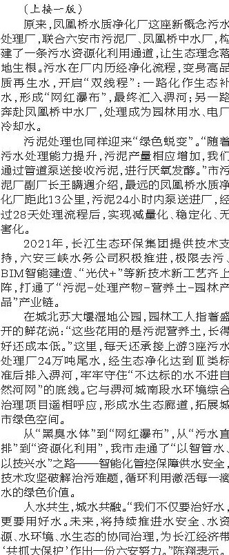 (上接一版) 原来,凤凰桥水质净化厂这座新概念污水处理厂,联合六安市污泥厂、凤凰桥中水厂,构建了一条污水资源化利用通道,让生态理念落地生根。污水在厂内历经净化流程,变身高品质再生水,开启“双线程”:一路化作生态补水,形成“网红瀑布”,最终汇入淠河;另一路奔赴凤凰桥中水厂,处理成为园林用水、电厂冷却水。 污泥处理也同样迎来“绿色蜕变”。“随着污水处理能力提升,污泥产量相应增加,我们通过管道泵送接收污泥,进行厌氧发酵。”市污泥厂副厂长王瞒遇介绍,最远的凤凰桥水质净化厂距此13公里,污泥24小时内泵送进厂,经过28天处理流程后,实现减量化、稳定化、无害化。 2021年,长江生态环保集团提供技术支持,六安三峡水务公司积极推进,极限去污、BIM智能建造、“光伏+”等新技术新工艺齐上阵,打通了“污泥-处理产物-营养土-园林产品”产业链。 在城北苏大堰湿地公园,园林工人指着盛开的鲜花说:“这些花用的是污泥营养土,长得好还成本低。”这里,每天还承接上游3座污水处理厂24万吨尾水,经生态净化达到Ⅲ类标准后排入淠河,牢牢守住“不达标的水不进自然河网”的底线。它与淠河城南段水环境综合治理项目遥相呼应,形成水生态廊道,拓展城市绿色空间。 从“黑臭水体”到“网红瀑布”,从“污水直排”到“资源化利用”,我市走通了“以智管水、以技兴水”之路——智能化管控保障供水安全,技术攻坚破解治污难题,循环利用激活每一滴水的绿色价值。 人水共生,城水共融。“我们不仅要治好水,更要用好水。未来,将持续推进水安全、水资源、水环境、水生态的协同治理,为长江经济带‘共抓大保护’作出一份六安努力。”陈翔表示。