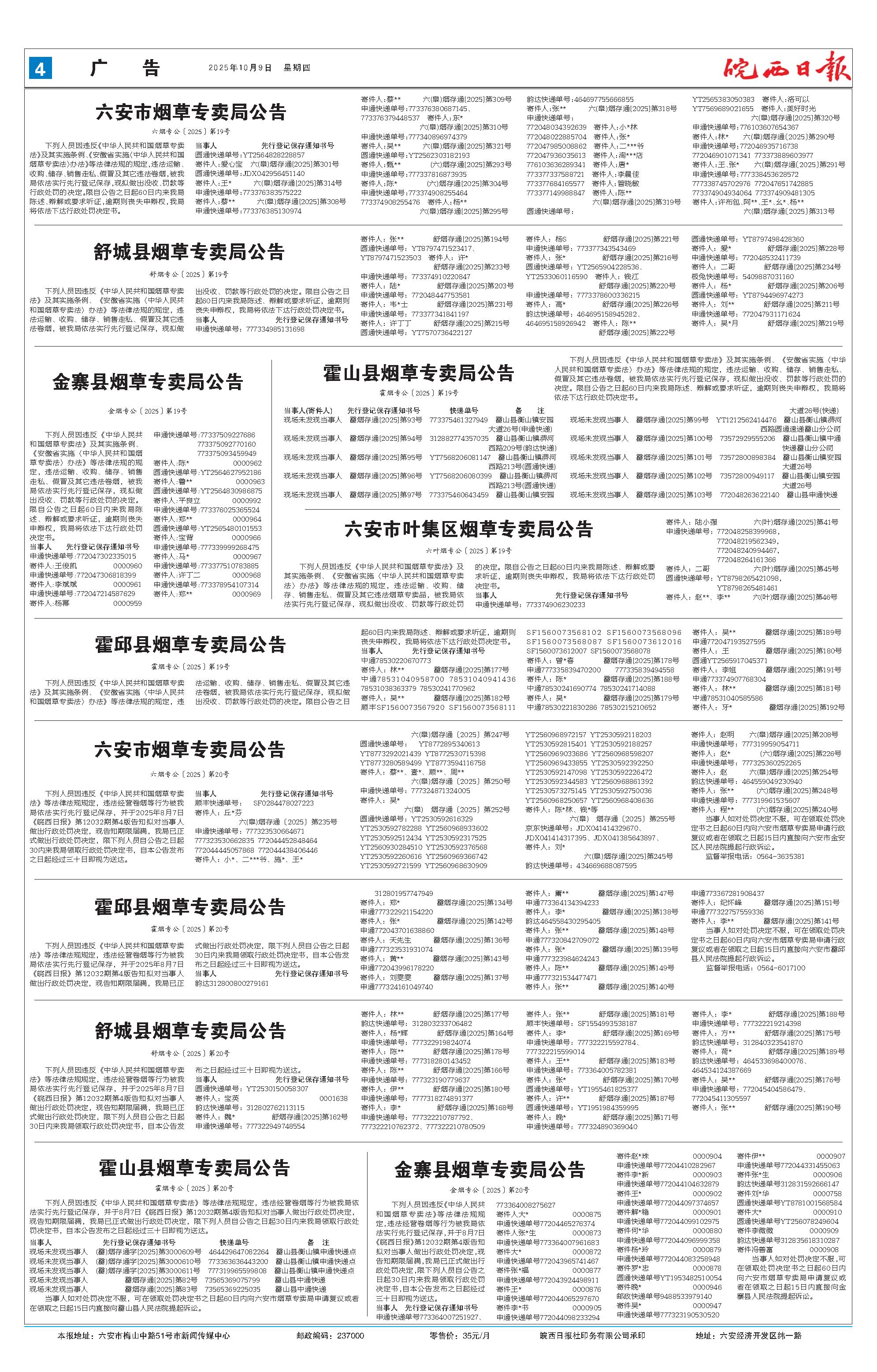 下列人员因违反《中华人民共和国烟草专卖法》及其实施条例、《安徽省实施〈中华人民共和国烟草专卖法〉办法》等法律法规的规定,违法运输、收购、储存、销售走私、假冒及其它违法卷烟,被我局依法实行先行登记保存,现拟做出没收、罚款等行政处罚的决定。限自公告之日起60日内来我局陈述、辩解或要求听证,逾期则丧失申辩权,我局将依法下达行政处罚决定书。 当事人 先行登记保存通知书号 中通78530220670773 寄件人:林** 霍烟存通[2025]第177号 中通78531040958700 78531040941436 78531038363379 78530241770962 寄件人:吴** 霍烟存通[2025]第182号 顺丰SF1560073567920 SF1560073568111 SF1560073568102 SF1560073568096 SF1560073568087 SF1560073612016 SF1560073612007 SF1560073568078 寄件人:曾*春 霍烟存通[2025]第178号 申通777335839470200 777335839494558 寄件人:陈* 霍烟存通[2025]第188号 中通78530241690774 78530241714088 寄件人:吴* 霍烟存通[2025]第179号 中通78530221830286 78530215210652 寄件人:吴** 霍烟存通[2025]第189号 申通772047193527595 寄件人:王 霍烟存通[2025]第180号 圆通YT2565917045371 寄件人:李姐 霍烟存通[2025]第191号 申通773374907768304 寄件人:林** 霍烟存通[2025]第181号 中通78531040585586 寄件人:牙* 霍烟存通[2025]第192号