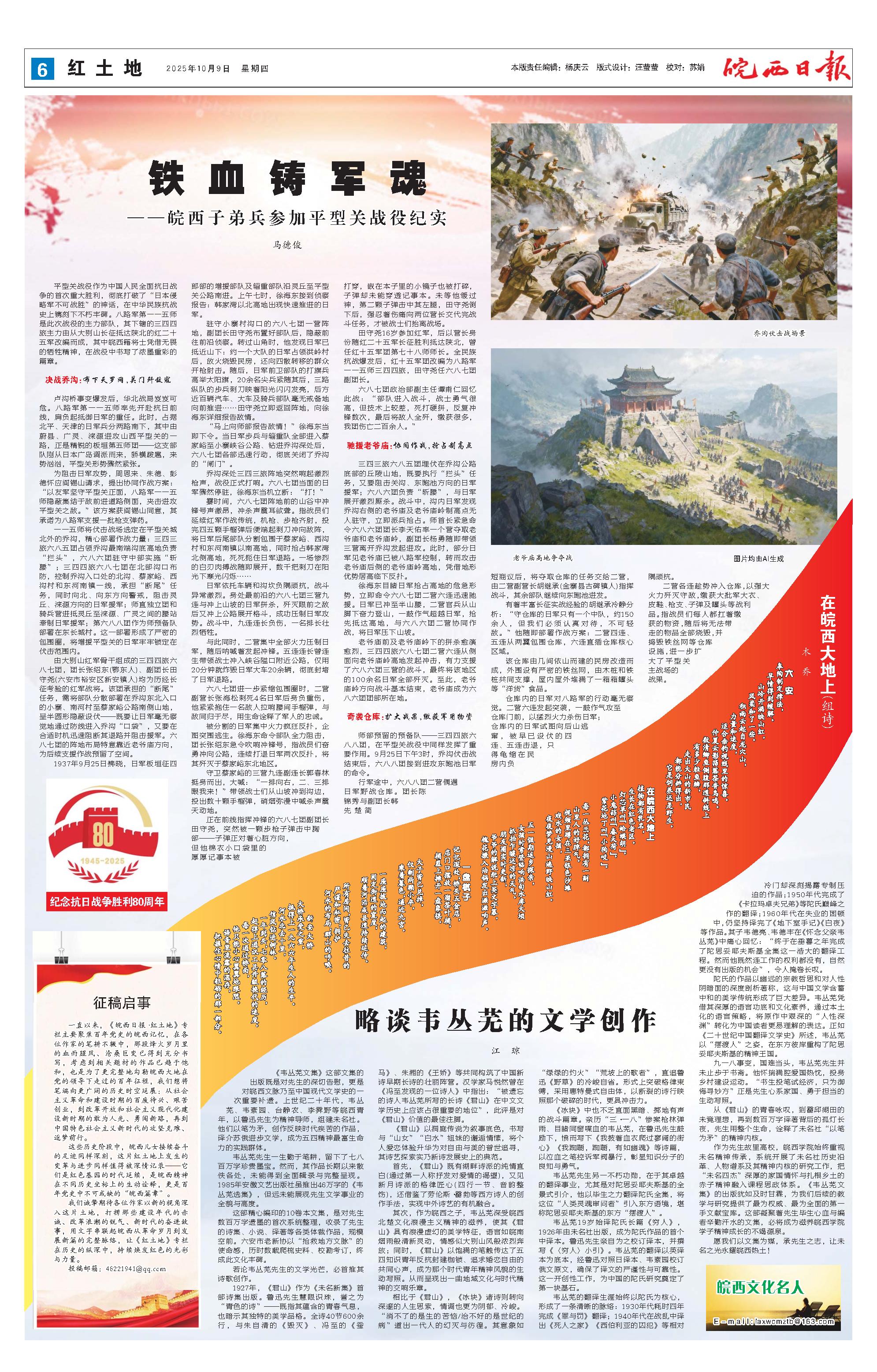 一直以来,《皖西日报·红土地》专栏主要聚焦百年党史的皖西记忆,在各位作家的笔耕不辍中,那段烽火岁月里的血雨腥风、沧桑巨变已得到充分书写,考虑到相关题材的作品已趋于饱和,也是为了更完整地勾勒皖西大地在党的领导下走过的百年征程,我们想将笔端向更广阔的历史时空延展:从社会主义革命和建设时期的百废待兴、艰苦创业,到改革开放和社会主义现代化建设新时期的敢为人先、勇闯新路,再到中国特色社会主义新时代的攻坚克难、逐梦前行。 这些历史阶段中,皖西儿女接续奋斗的足迹同样深刻,这片红土地上发生的变革与进步同样值得被深情记录——它们是红色基因的时代延续,是皖西精神在不同历史坐标上的生动诠释,更是百年党史中不可或缺的“皖西篇章”。 我们诚挚期待各位作家以新的视角深入这片土地,打捞那些建设年代的赤诚、改革浪潮的锐气、新时代的奋进故事,用文字串联起皖西从革命岁月到发展新篇的完整脉络,让《红土地》专栏在历史的纵深中,持续焕发红色的光彩与力量。 投稿邮箱:48221941@qq.com