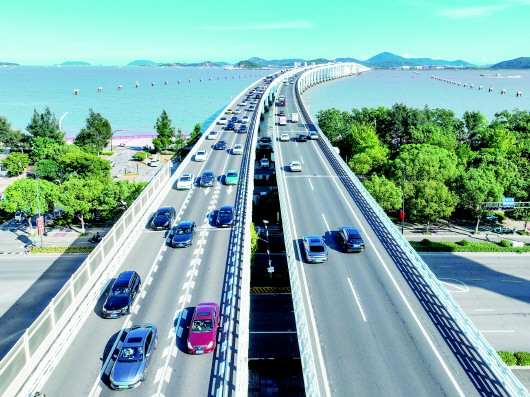 10月7日,在浙江省舟山市普陀区,车辆行驶在朱家尖海峡大桥上(无人机照片)。