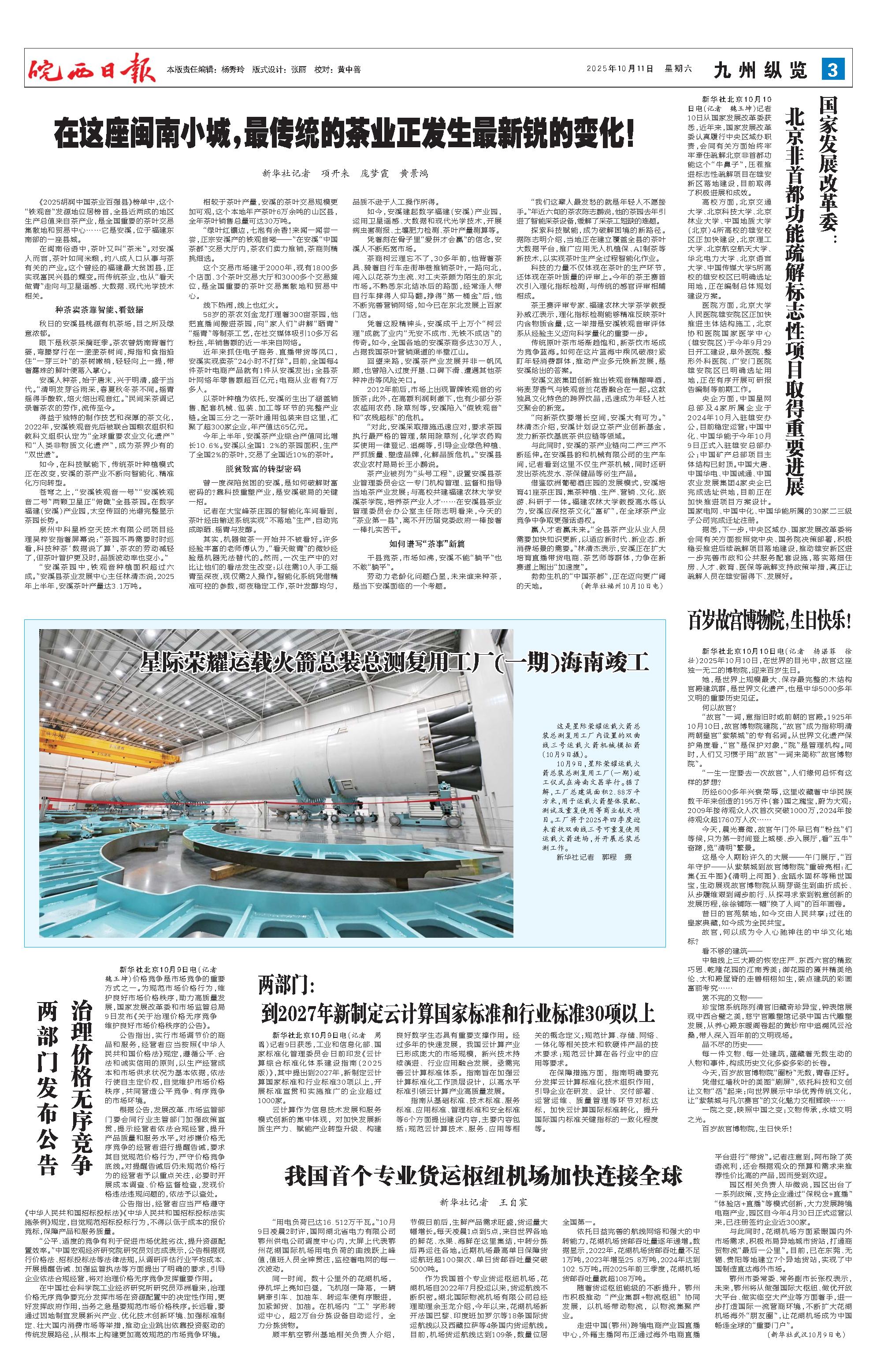 《2025胡润中国茶业百强县》榜单中,这个“铁观音”发源地位居榜首,全县近两成的地区生产总值来自茶产业,是全国重要的茶叶交易集散地和贸易中心……它是安溪,位于福建东南部的一座县城。 在闽南俗语中,茶叶又叫“茶米”。对安溪人而言,茶叶如同米粮,约八成人口从事与茶有关的产业。这个曾经的福建最大贫困县,正实现富民兴县的蝶变。而传统茶业,也从“看天做青”走向与卫星遥感、大数据、现代光学技术相关。 种茶卖茶靠智能、看数据 秋日的安溪县桃源有机茶场,目之所及绿意浓郁。 眼下是秋茶采摘旺季。茶农曾炳南背着竹篓,弯腰穿行在一垄垄茶树间,拇指和食指掐住“一芽三叶”的茶树嫩梢,轻轻向上一提,带着露珠的鲜叶便落入掌心。 安溪人种茶,始于唐末,兴于明清,盛于当代。“清明发芽谷雨采,春夏秋冬茶不同。摇青摇得手酸软,焙火焙出观音红。”民间采茶调记录着茶农的劳作,流传至今。 得益于独特的制作技艺和深厚的茶文化,2022年,安溪铁观音先后被联合国粮农组织和教科文组织认定为“全球重要农业文化遗产”和“人类非物质文化遗产”,成为茶界少有的“双世遗”。 如今,在科技赋能下,传统茶叶种植模式正在改变,安溪的茶产业不断向智能化、精准化方向转型。 苍穹之上,“安溪铁观音一号”“安溪铁观音二号”两颗卫星正“俯瞰”全县茶园。在数字福建(安溪)产业园,太空传回的光谱完整显示茶园长势。 泉州中科星桥空天技术有限公司项目经理吴梓安指着屏幕说:“茶园不再需要时时巡看,科技种茶‘数据说了算’,茶农的劳动减轻了,但茶叶管护更及时,品质波动率也变小。” “安溪茶园中,铁观音种植面积超过六成。”安溪县茶业发展中心主任林清杰说,2025年上半年,安溪茶叶产量达3.1万吨。 相较于茶叶产量,安溪的茶叶交易规模更加可观,这个本地年产茶叶6万余吨的山区县,全年茶叶销售总量可达30万吨。 “绿叶红镶边,七泡有余香!来闻一闻尝一尝,正宗安溪产的铁观音喽——”在安溪“中国茶都”交易大厅内,茶农们卖力推销,茶商则精挑细选。 这个交易市场建于2000年,现有1800多个店面、3个茶叶交易大厅和3000多个交易摊位,是全国重要的茶叶交易集散地和贸易中心。 线下热闹,线上也红火。 58岁的茶农刘金龙打理着300亩茶园,他把直播间搬进茶园,向“家人们”讲解“晒青”“摇青”等制茶工艺,在社交媒体吸引10多万名粉丝,年销售额的近一半来自网络。 近年来抓住电子商务、直播带货等风口,安溪实现卖茶“24小时不打烊”。目前,全国每4件茶叶电商产品就有1件从安溪发出;全县茶叶网络年零售额超百亿元;电商从业者有7万多人。 以茶叶种植为依托,安溪衍生出了涵盖销售、配套机械、包装、加工等环节的完整产业链。全国三分之一茶叶通用包装来自这里,汇聚了超300家企业,年产值达65亿元。 今年上半年,安溪茶产业综合产值同比增长10.6%。安溪以全国1.2%的茶园面积,生产了全国2%的茶叶,交易了全国近10%的茶叶。 脱贫致富的转型密码 曾一度深陷贫困的安溪,是如何破解财富密码的?靠科技重塑产业,是安溪破局的关键一招。 记者在大宝峰茶庄园的智能化车间看到,茶叶经由输送系统实现“不落地”生产,自动完成晾晒、摇青与发酵。 其实,机器做茶一开始并不被看好。许多经验丰富的老师傅认为,“看天做青”的微妙经验是机器无法替代的。然而,一次生产中的对比让他们的看法发生改变:以往需10人手工摇青至深夜,现仅需2人操作。智能化系统凭借精准可控的参数,彻夜稳定工作,茶叶发酵均匀,品质不逊于人工操作所得。 如今,安溪建起数字福建(安溪)产业园,运用卫星遥感、大数据和现代光学技术,开展病虫害测报、土壤肥力检测、茶叶产量测算等。 凭着刻在骨子里“爱拼才会赢”的信念,安溪人不断拓宽市场。 茶商柯云理忘不了,30多年前,他背着茶具、骑着自行车走街串巷推销茶叶,一路向北,闯入以花茶为主流、对工夫茶颇为陌生的东北市场。不熟悉东北结冰后的路面,经常连人带自行车摔得人仰马翻。挣得“第一桶金”后,他不断完善营销网络,如今已在东北发展上百家门店。 凭着这股精神头,安溪成千上万个“柯云理”成就了业内“无安不成市、无铁不成店”的传奇。如今,全国各地的安溪茶商多达30万人,占据我国茶叶营销渠道的半壁江山。 回望来路,安溪茶产业发展并非一帆风顺,也曾陷入过度开垦、口碑下滑、遭遇其他茶种冲击等风险关口。 2012年前后,市场上出现冒牌铁观音的劣质茶;此外,在高额利润刺激下,也有少部分茶农滥用农药、除草剂等,安溪陷入“假铁观音”和“农残超标”的危机。 “对此,安溪采取措施迅速应对,要求茶园执行最严格的管理,禁用除草剂,化学农药购买使用一律登记、追溯等,引导企业绿色种植、严抓质量、塑造品牌,化解品质危机。”安溪县农业农村局局长王小鹏说。 茶产业被列为“头号工程”,设置安溪县茶业管理委员会这一专门机构管理、监督和指导当地茶产业发展;与高校共建福建农林大学安溪茶学院,培养茶产业人才……在安溪县茶业管理委员会办公室主任陈志明看来,今天的“茶业第一县”,离不开历届党委政府一棒接着一棒扎实苦干。 如何谱写“茶事”新篇 千县竞茶,市场如沸,安溪不能“躺平”也不敢“躺平”。 劳动力老龄化问题凸显,未来