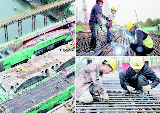 10月13日,六安城区五里墩大桥拆除重建工程施工现场,几台挖掘机与绳锯、吊机等设备协同作业,正在对老桥主体桥面结构进行破除与卸载(左图)。与此同时,新建的左右边幅桥桥面施工稳步推进,工人们正在进行钢筋焊接(右上图)、捆扎(右下图)等上部结构作业。 据了解,该项目抢抓当前气候利好时机,加快建设步伐,10月7日起正式启动对老桥主桥面拆除作业,预计到11月底完成老桥主体结构拆除及新建左右边幅桥主体浇筑施工后,进行新建中幅桥桩基及承台等基础施工。目前该项目整体进度已达45%,计划明年8月上旬全面完工并实现通车。 本报记者 田凯平 摄