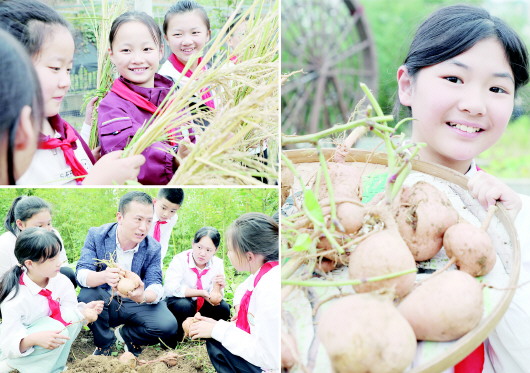 10月14日,裕安区淠河小学的同学们在校园劳动实践基地亲手收割成熟的水稻,感受劳动的艰辛和粮食的来之不易(左上图)。 10月16日是世界粮食日,该校将节粮、爱粮、惜粮教育从课堂搬到田间地头,通过组织学生亲身体验挖红薯、收水稻、种蔬菜等农事劳动,让孩子们认识农作物,了解农耕生产的艰辛,教育引导大家自觉养成勤俭美德,反对浪费,争做爱粮节粮小公民。 左下图:淠河小学的老师在学校“早竹园”劳动实践基地带领同学们挖红薯,讲解“一粥一饭、来之不易”的道理。 右图:淠河小学的学生展示在校园劳动实践基地采收的红薯,分享丰收喜悦。 本报记者 田凯平 通讯员 罗成 摄