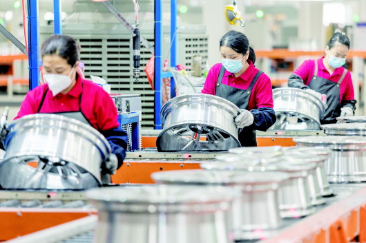 近年来,裕安区紧抓产业机遇,持续优化营商环境,通过精准服务企业,推动新兴产业集群发展。今年上半年,全区新能源汽车零部件规模工业总产值9.36亿元,同比增长14.68%;新材料产业总产值31.08亿元,同比增长42.29%,六安高新区成功获评2025年“安徽省制造业数字化转型示范园区”,裕安区金属基复合材料产业集群入选“省级中小企业特色产业集群”,区域产业转型与创新发展的成效显著。 图为近日在位于六安高新区境内的安徽今飞轮毂有限公司的智能化车间内,6条全自动化产线高效运转,工人有序协作,一批批新能源汽车轮毂顺利下线。 张军 摄