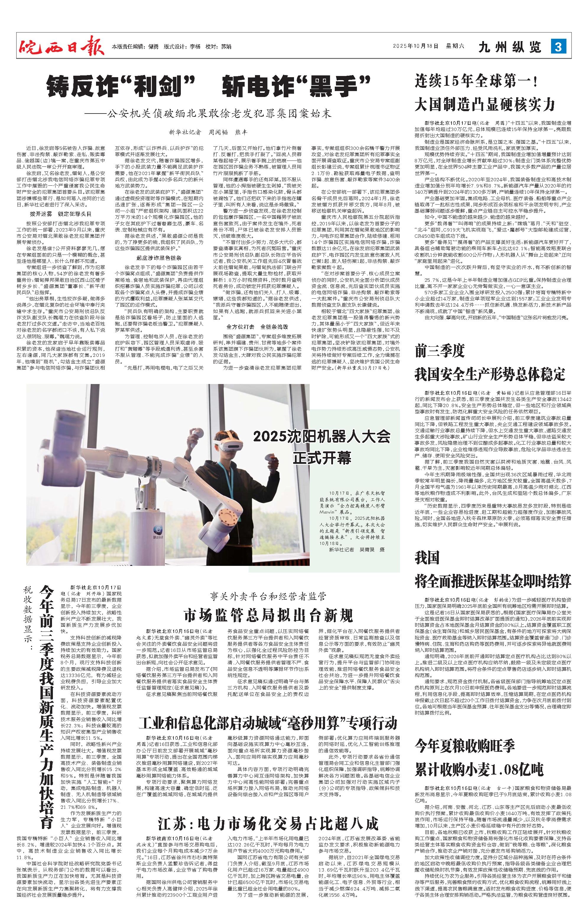 新华社北京10月16日电(记者 古一平)国家粮食和物资储备局最新发布消息显示,今年夏粮收购旺季已于9月底结束,累计收购小麦1.08亿吨。 据介绍,河南、安徽、河北、江苏、山东等主产区先后启动小麦最低收购价执行预案,累计收购最低收购价小麦1640万吨,有效发挥了政策托底作用,市场运行保持平稳。随着市场流通量减少,以及秋冬季消费需求增加,10月以来,主产区小麦价格延续稳中有升的良好态势。 目前,各地秋粮已收获上市,秋粮收购工作正陆续展开。针对秋粮收购工作重点,国家粮食和物资储备局将强化市场化收购要素保障,支持各类经营主体落实粮食收购资金和仓容,做到“钱等粮、仓等粮”。深化粮食产销合作,推动农企产销对接,充分激发市场购销活力。 加大政策性收储调控力度。坚持分区域分品种施策,及时在符合条件的地区启动中晚稻最低收购价执行预案,指导各级各类储备企业合理把握收储轮换时机节奏,有效发挥政策性收储稳预期、兜底线的作用。 持续优化为农为企服务。引导各类经营主体为农户开展粮食烘干和储存等产后服务,完善粮食预约收购方式,优化粮食收购流程,统筹用好线上线下渠道,提高农民售粮满意度。适时发布粮食收购进度、价格等信息,便于各类主体合理安排购销活动。严格执法监管,为粮食收购营造良好氛围。