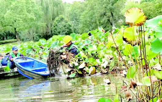 近日,市园林绿化管理处对六安市区各大公园荷塘内的残荷、枯叶进行集中清理,为水生生态系统“舒筋活络”,静待来年“接天莲叶”的盛景。据了解,此次清理工作将持续数周,清理出的荷叶等植物残体将统一运往处理站,进行无害化堆肥处理,实现资源循环利用。 本报记者 袁洁 摄