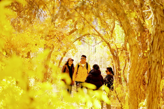 10月19日,游客在甘肃省敦煌市莫高镇的胡杨林中游览。