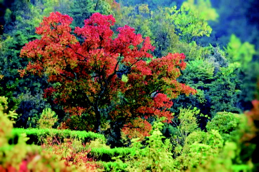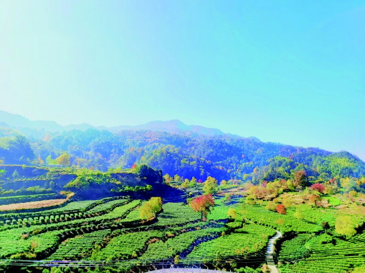 “我们曾经终日游荡在故乡的青山上,我们也曾历经苦辛到处奔波流浪……”,是的,歌词里的“乡”让人觉得格外温暖又亲切。当车子行驶到乌桕谷入口时,一棵棵树干笔直、树枝肆意伸展的乌桕映入眼帘,透过翠绿的叶,我看到了刻在青石上的“乡愁”二字。 乌桕本是农村田间地头极其常见的树木,生命力顽强,田埂边,池塘岸,地堑上,总能长出很大的树来。记得小时候父母会搭把梯子用刀把乌桕籽剌下来送去镇上卖,给我们买纸和笔,隐约知道乌桕有药用价值,也有点值钱。后来从文章里才了解到乌桕是极具乡土情结的树种,是让人思乡情重的树种。至于从什么时候开始变成观赏性树木的,不得而知。或许是那年秋天,乌桕红满整个茶园,红与绿的视觉盛宴吸引了一批又一批的文人旅者。是的,那个秋的乌桕也成了金寨县吴家店镇一张闪亮的名片。 秋风起,秋意渐浓,独自撑伞从乌桕谷往前走,偌大的茶园在烟雨蒙蒙间变得愈是静谧,大片的乌桕树,叶子似翡翠般沁绿,黄色小花穗似粟米般一排排,条状的花穗挂在茂密的枝叶间,枝条的顶端刚灿放的叶儿又是绿中透红,怎不算是一片“花团锦簇”呢?在茶香里观赏乌桕,赏景不知景已深,哪怕雨天,也似有渐行渐远的痴态。 当黄花成果,乌桕就开始执着于叶的升华了,越近秋,果儿越大,叶儿越红,在越吹越冷的秋风里,椭圆的叶子会左右前后上下地晃动,还带着些悦耳的声响,晨曦和晚霞下光洁的一面会随着晃动发出熠熠的光,斑驳的、晶亮的、闪耀的种种,从清清楚楚的一团绿意到朦朦胧胧的一团暗红,再从羞羞答答的一片潮红到蓬蓬勃勃的一片绯红,是的,她在秋里,格外张扬地美着。秋的画卷,浅浅乡愁,缱绻于心。 秋去冬来,繁华褪尽,红的叶子会落去,乌桕果外面黑色的壳裹不住里面急于迸发的雪白果子,这时的乌桕果纯白色且分为三或四瓣,远远望去,就如清代袁枚在《随园诗话》中记载:“余冬日山行,见桕子离离,误认梅蕊。”头微仰,犹见喜鹊数只,悠闲傍在枝头观冬景,麻雀群群,只为那白色果实以饱腹。而你,就当那满树雪白如梅花赏,何不是一份雅兴。 乌桕之美,不止于秋。吴家店镇乌桕谷之景美,亦不止于秋。