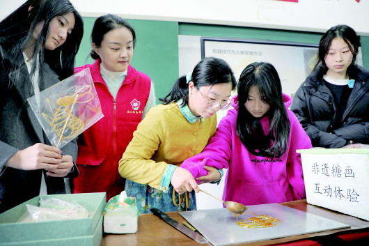 12月1日,在第34个“国际残疾人日”来临之际,六安市图书馆青年志愿者与非遗传承人一起,走进六安市特殊教育学校,开展“甜蜜非遗 与爱同行”志愿服务活动,通过宣传非遗、体验糖画制作等形式,开启一段甜蜜的非遗之旅,让传统文化的种子滋润残障学生的心灵,感受非遗的独特魅力。 图为糖画非遗传承人侯守琴(左三)在教学生体验非遗糖画制作。 本报记者 田凯平 摄